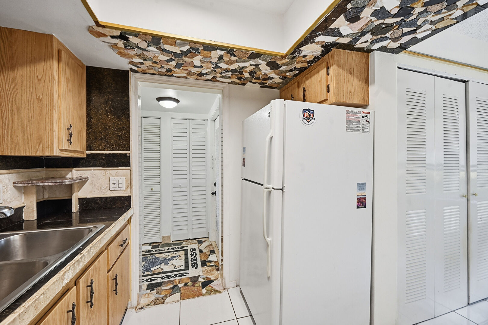 Ceiling Fan, Drywall, Medium Brown Cabinets, Natural Light, Pass Through Window, Stone Tile Countertops, Textured Ceiling, Tile Floor, Visible Hinge Cabinets, Pass Through Window, Tile Floor, Visible Hinge Cabinets