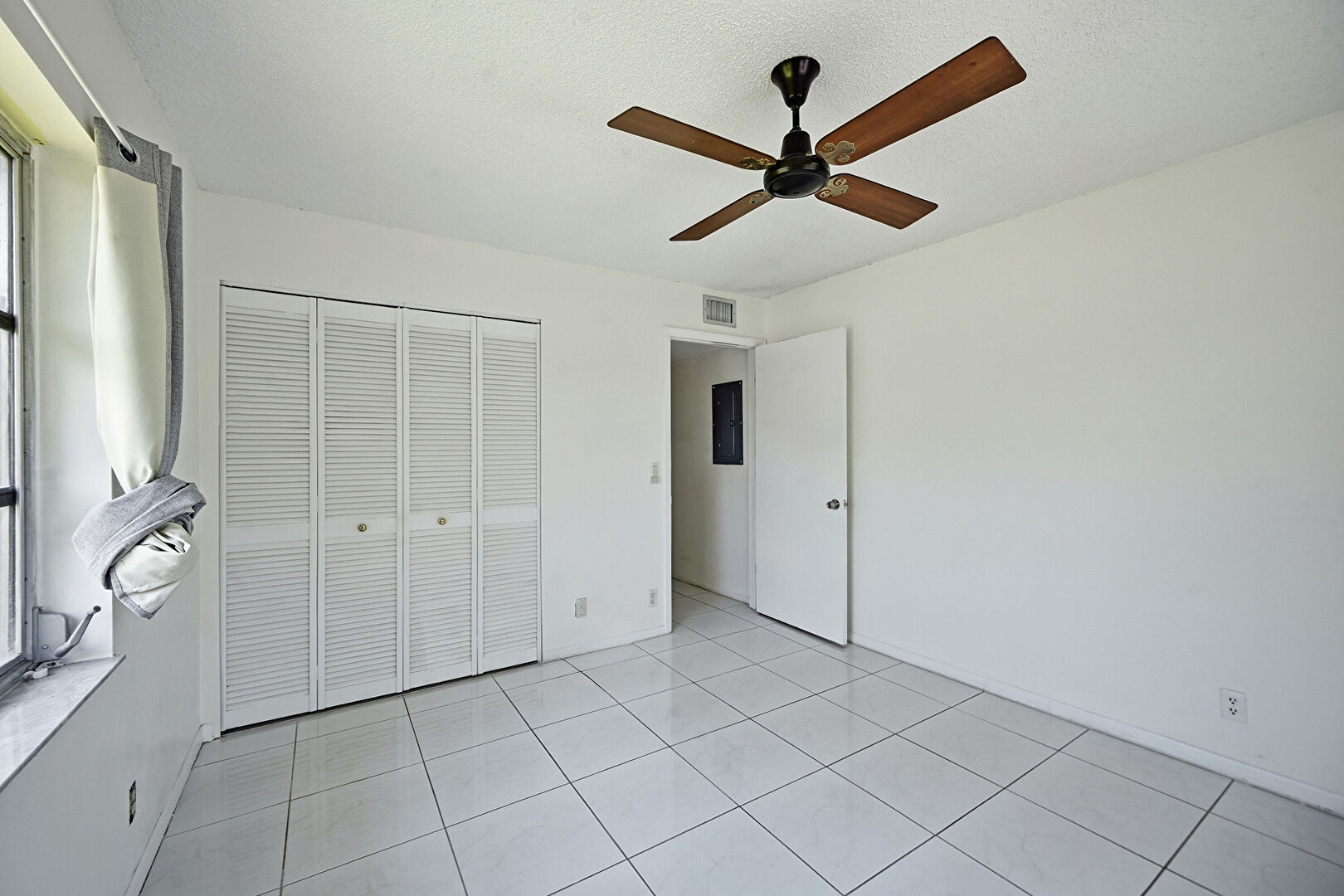 Baseboards Wall, Ceiling Fan, Closet, Drywall, Electric Panel, Natural Light, Textured Ceiling, Tile Floor, Vent, Drywall, Textured Ceiling