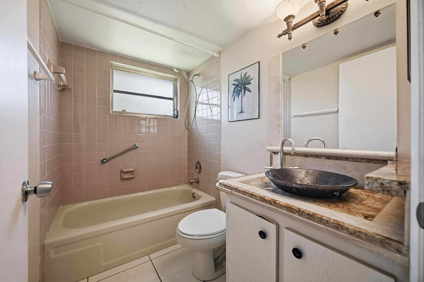 Combined Bath Shower, Drywall, Full Bathroom, Natural Light, Vanity, Tile Floor