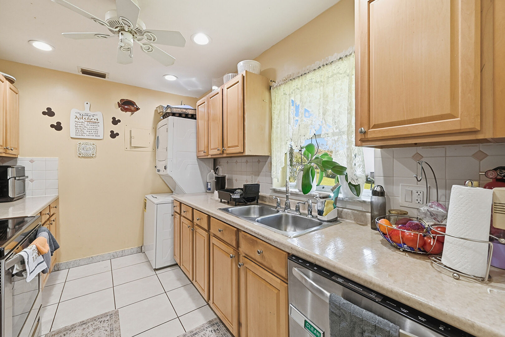 Baseboards Wall, Ceiling Fan, Drywall, Laundry, Natural Light, Raised Cabinets, Recessed Lighting, Tile Floor, Vent, Washer Dryer, Raised Cabinets, Recessed Lighting, Tile Floor