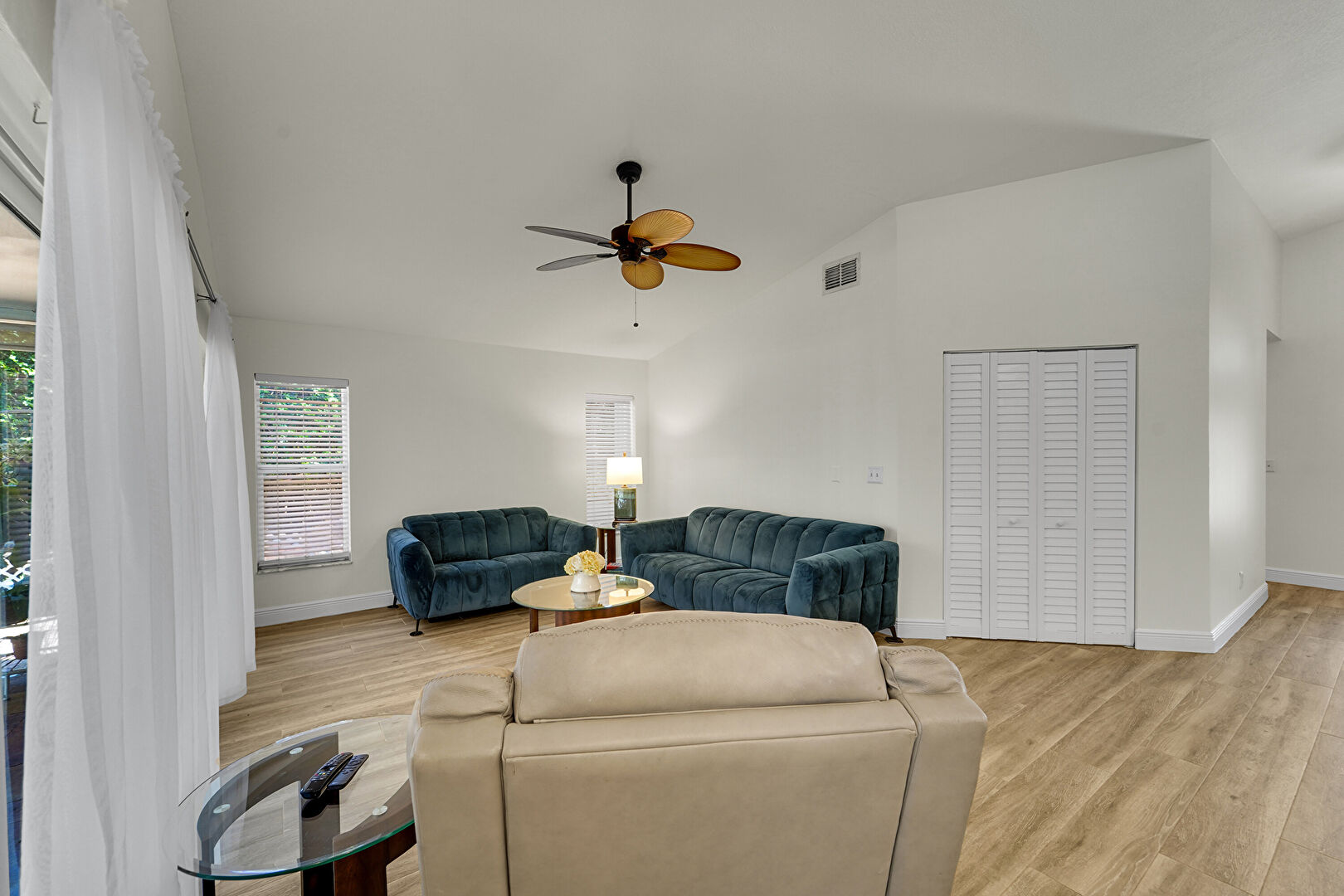 Baseboards Wall, Ceiling Fan, Drywall, High Ceiling, Natural Light, Notable Chandelier, Recessed Lighting, Vaulted Ceiling, Wood Finish Floor, Drywall, Vent