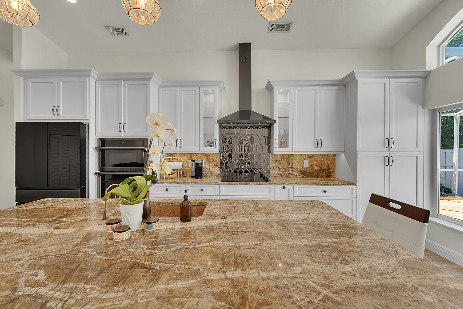 Baseboards Wall, Crown Molding Cabinets, Double Oven, Drywall, Glass Insert Cabinets, High Ceiling, Kitchen Bar, Kitchen Island, Natural Light, Notable Chandelier, One Wall Kitchen, Pendant Lighting, Recessed Lighting, Shaker Cabinets, Stone Countertops, Vaulted Ceiling, Vent, Wood Finish Floor, Baseboards Wall, Drywall, Glass Insert Cabinets, Recessed Lighting