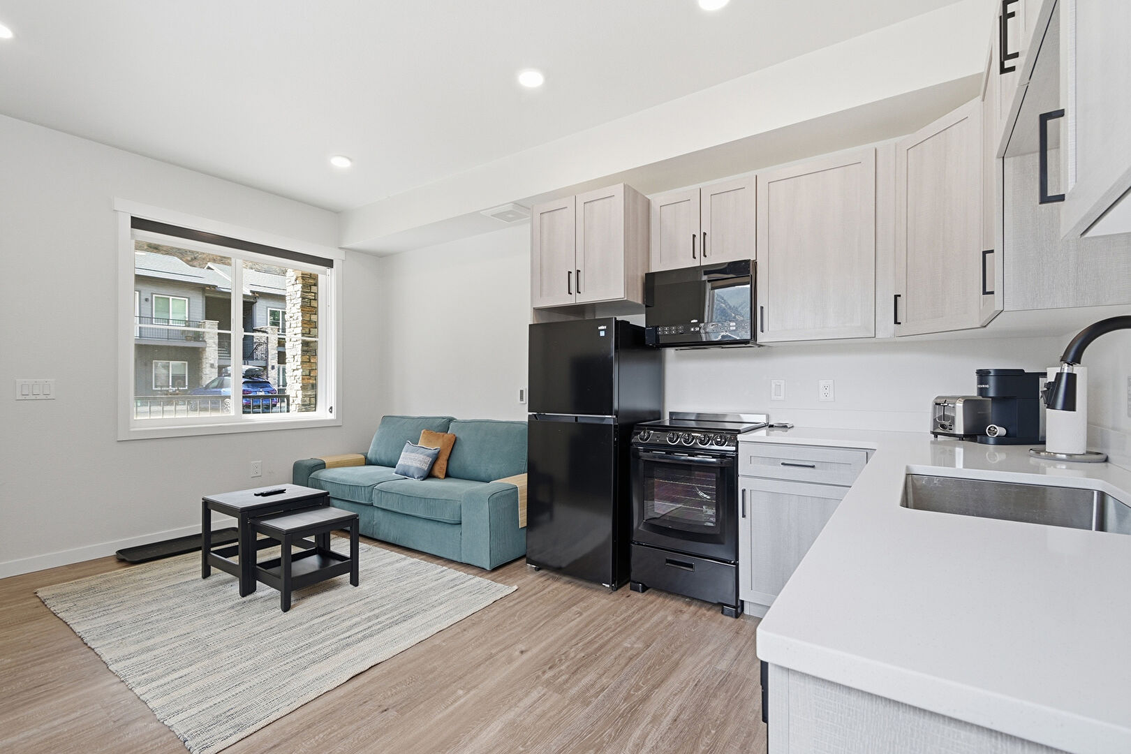 Baseboards Wall, Drywall, L Shaped Kitchen, Natural Light, Opens To Living Area, Recessed Lighting, Shaker Cabinets, Stone Countertops, Wood Finish Floor, Stone Countertops, Wood Finish Floor