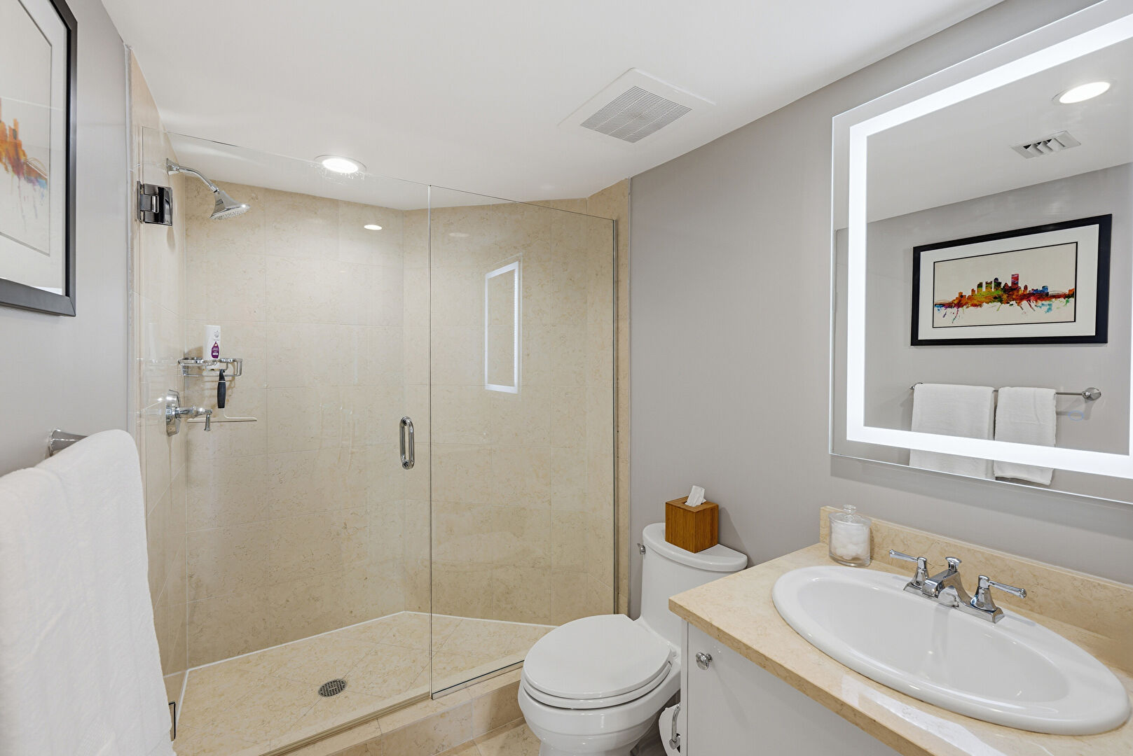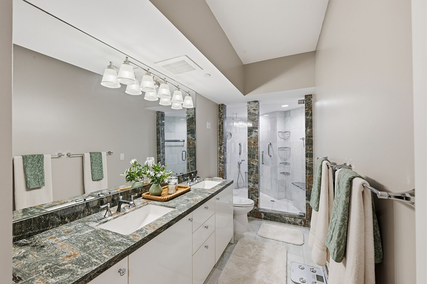 Combined Bath Shower, Drywall, Full Bathroom, Recessed Lighting, Tile Wall, Vanity, Vent, Double Vanity, Recessed Lighting, Tile Floor, Vanity