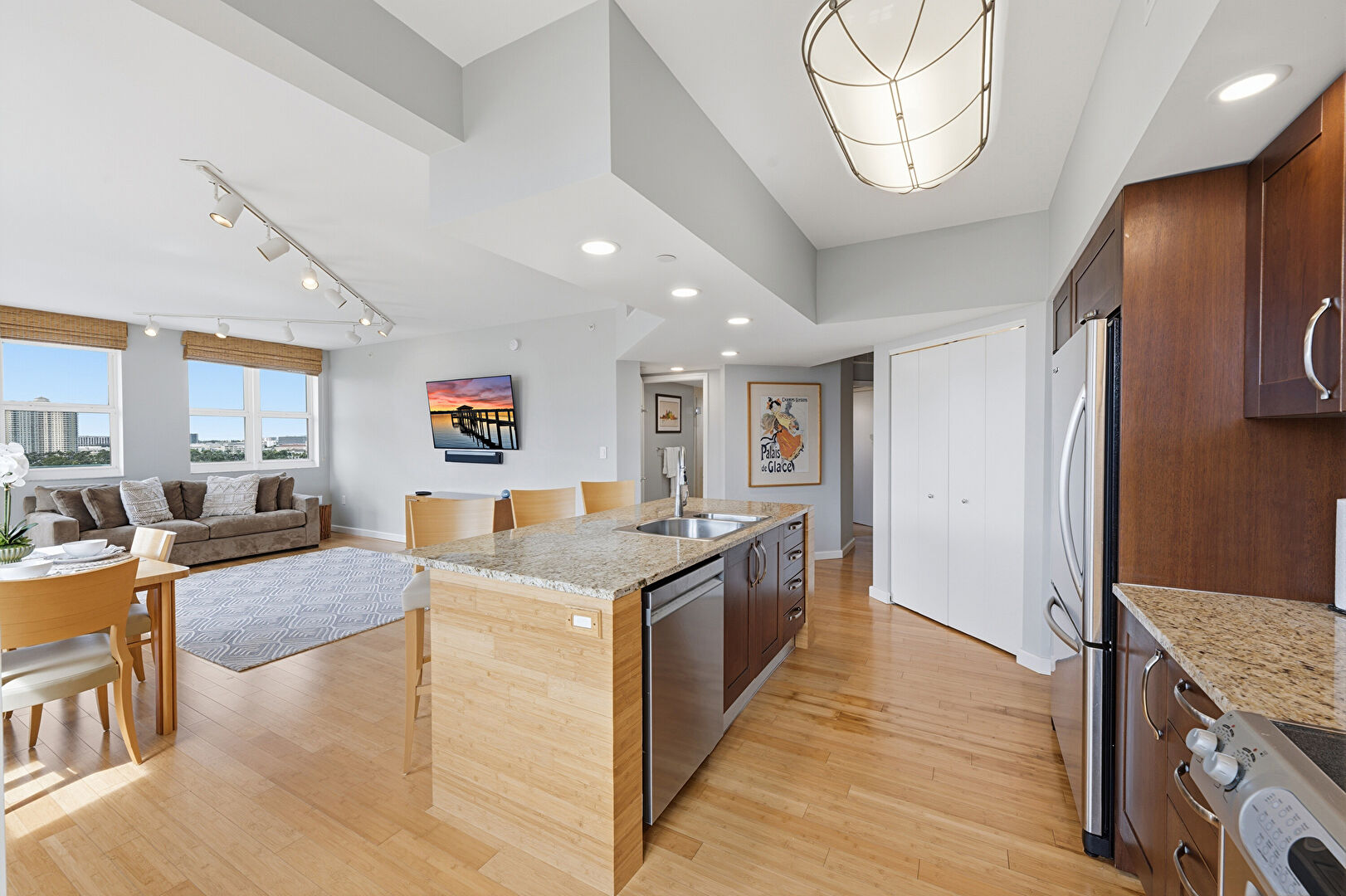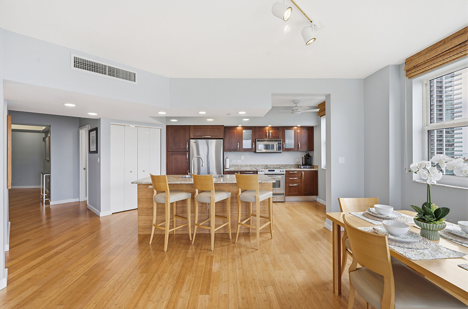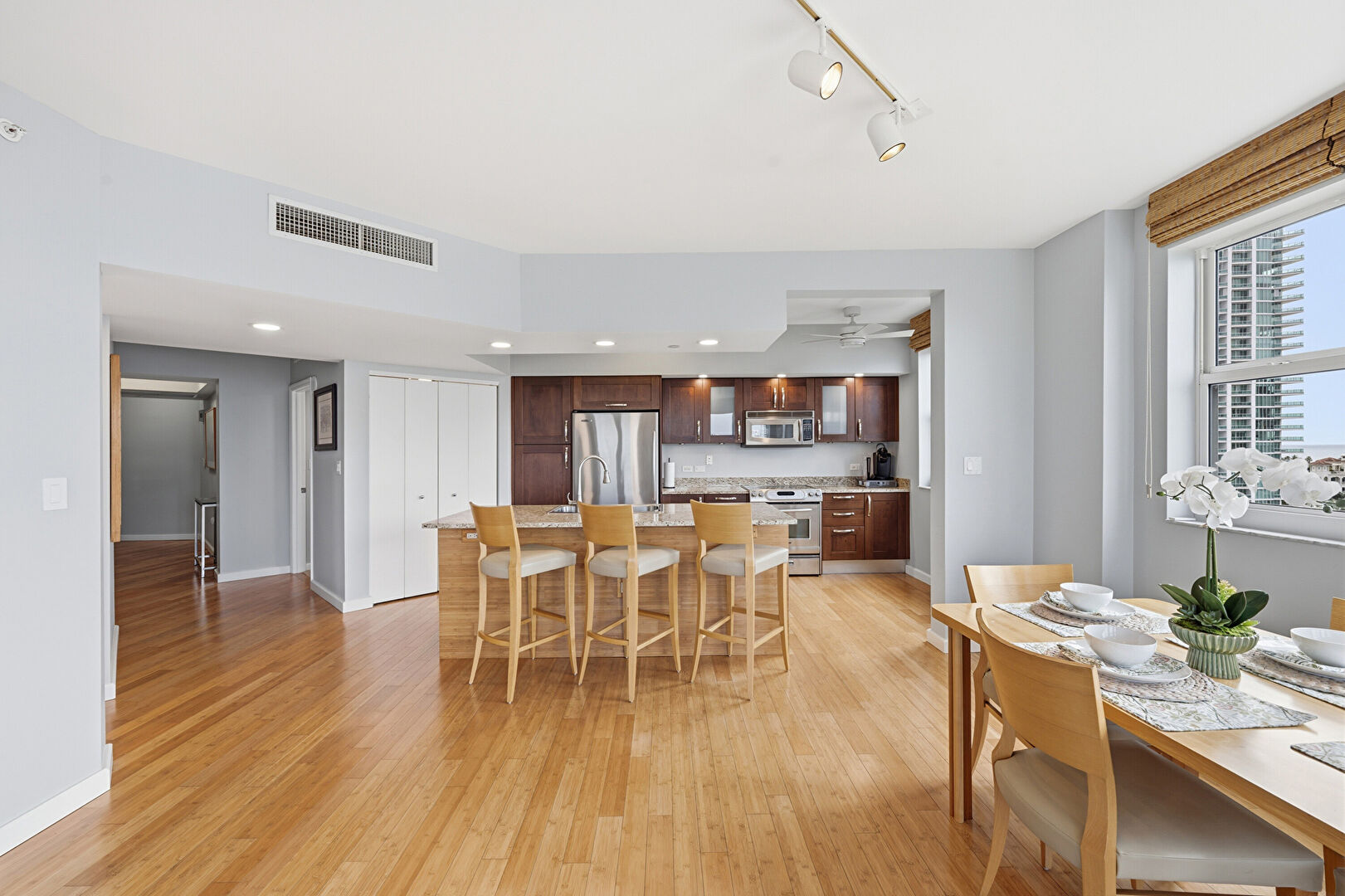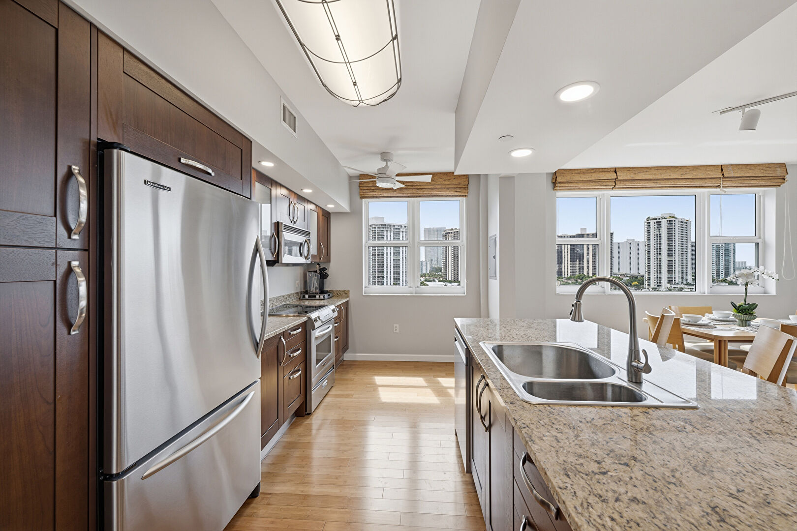 Baseboards Wall, Ceiling Fan, City View, Dark Brown Cabinets, Drywall, Kitchen Bar, Kitchen Island, Laundry, Natural Light, One Wall Kitchen, Opens To Living Area, Recessed Lighting, Shaker Cabinets, Stone Countertops, Track Lighting, Vent, Wood Finish Floor, Baseboards Wall, Dark Brown Cabinets, Medium Brown Cabinets, One Wall Kitchen, Opens To Living Area, Stone Countertops, Wood Finish Floor