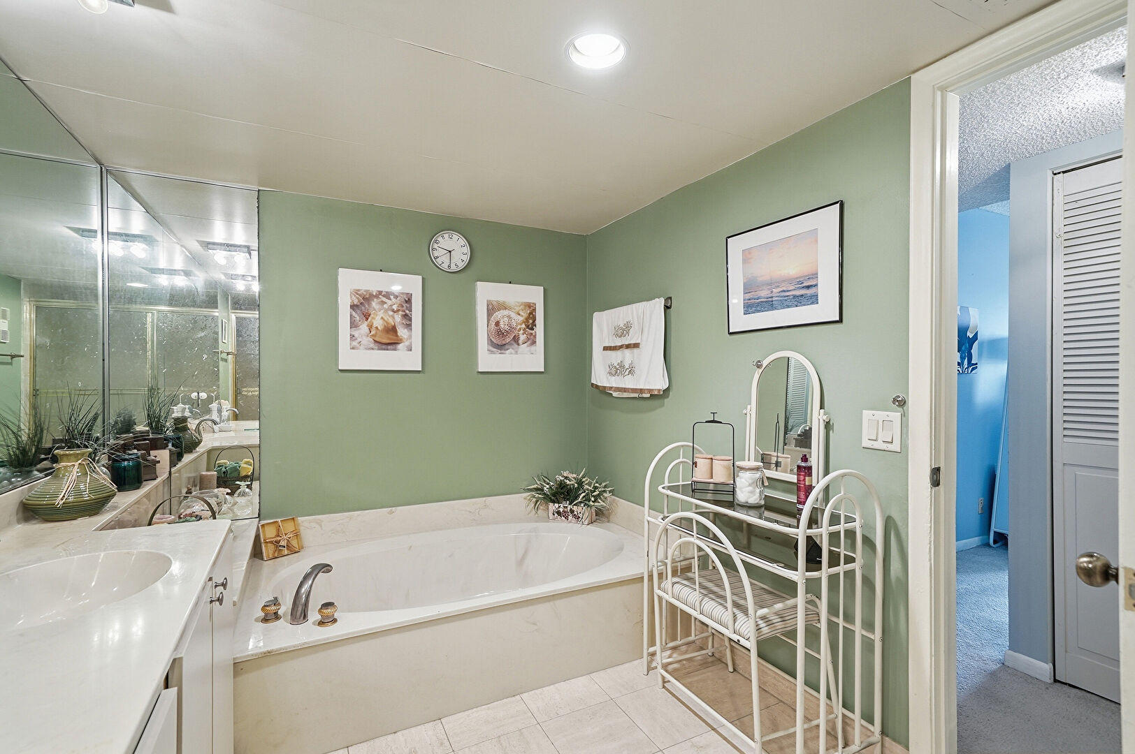 Baseboards Wall, Carpet, Closet, Double Vanity, Drywall, Full Bathroom, Recessed Lighting, Tile Floor, Vanity, Full Bathroom, Tile Floor