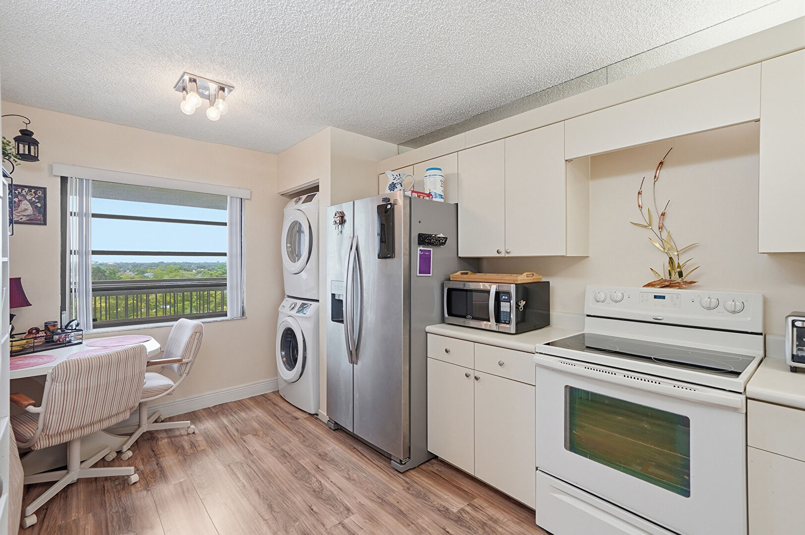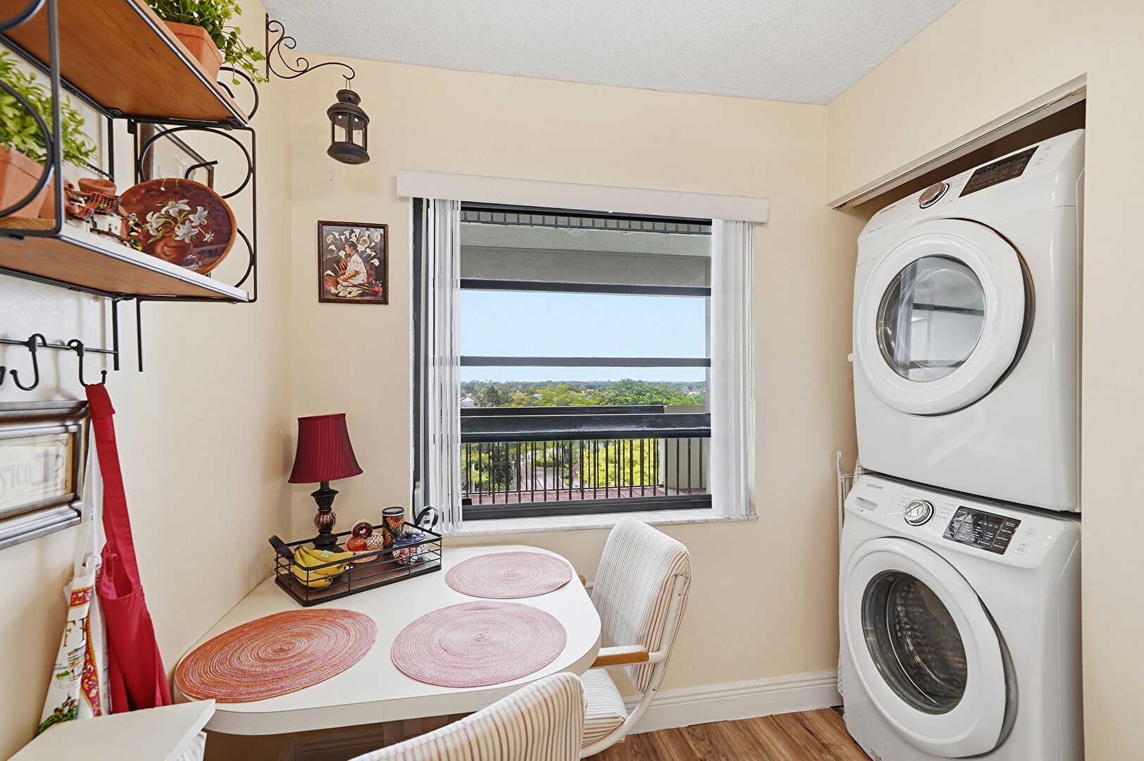 Baseboards Wall, Drywall, Laundry, Natural Light, Pass Through Window, Textured Ceiling, Toaster, Wood Finish Floor, Opens To Living Area, Pass Through Window, Toaster