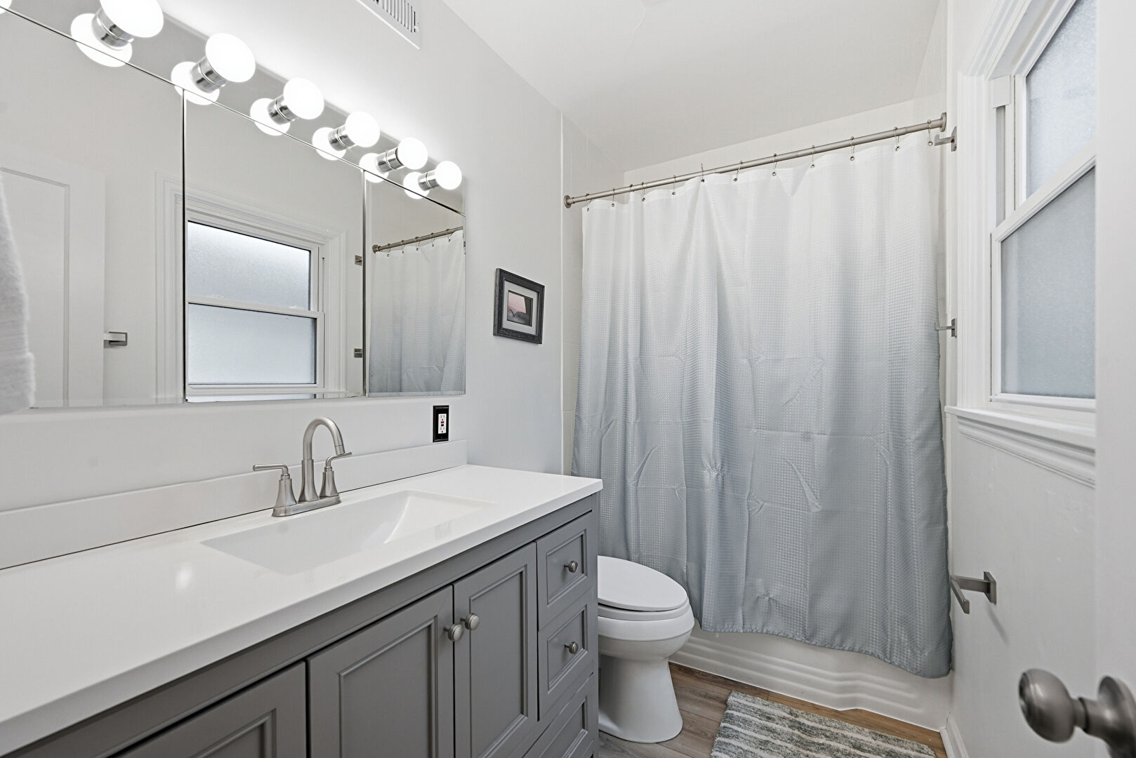 Combined Bath Shower, Drywall, Natural Light, Vanity, Vent, Wood Finish Floor, Full Bathroom