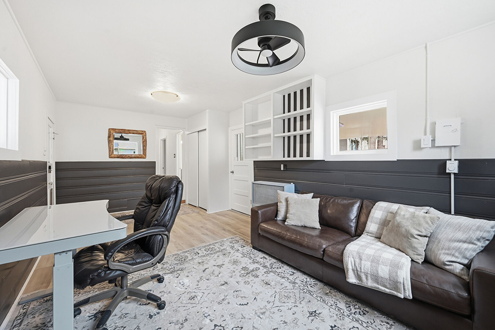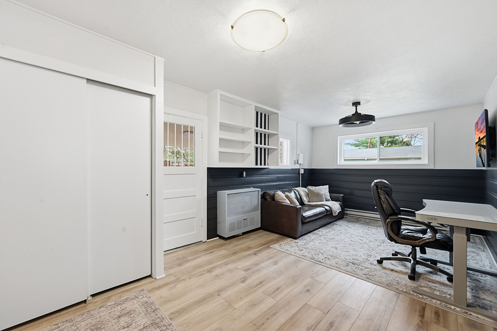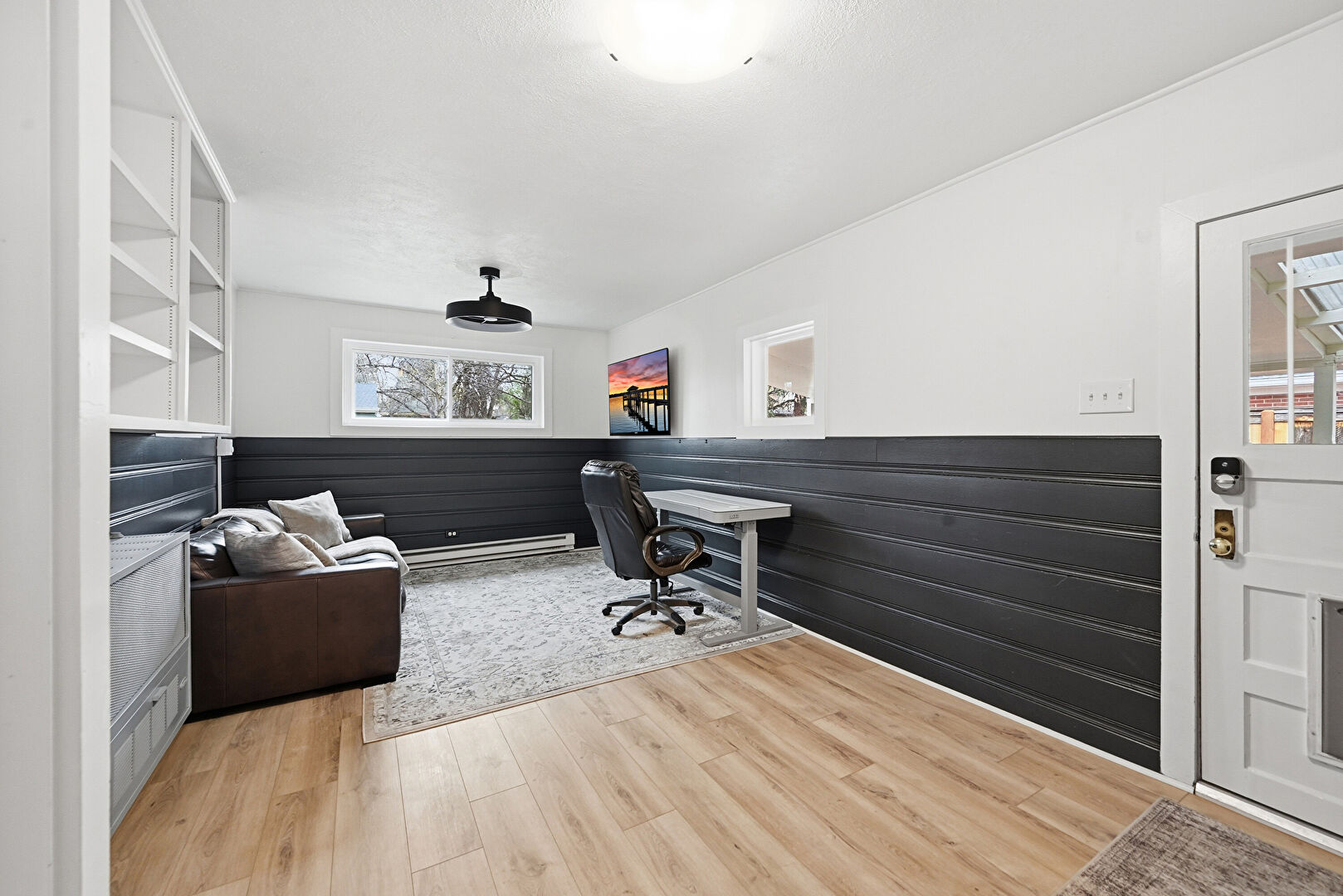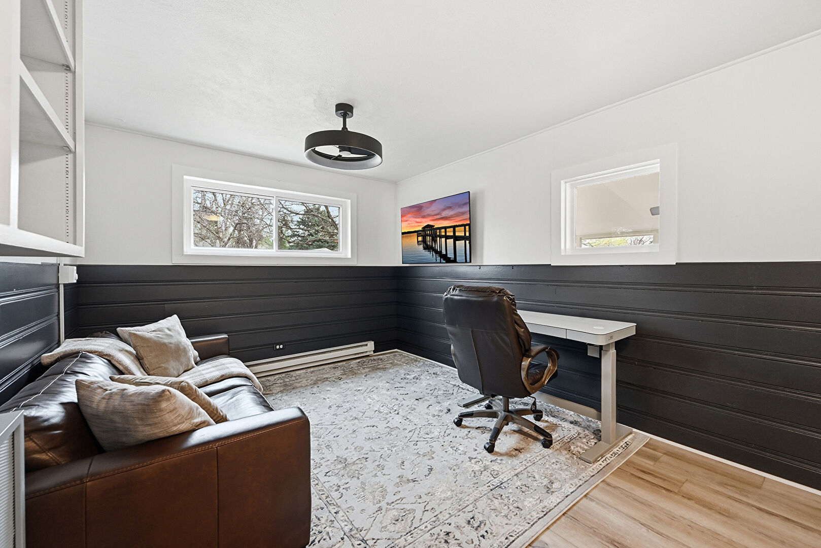 Baseboard Radiator, Ceiling Fan, Drywall, Natural Light, Office Area, Space Heater, Wainscot Wall, Wood Finish Floor, Wood Wall, Natural Light, Office Area, Wood Finish Floor