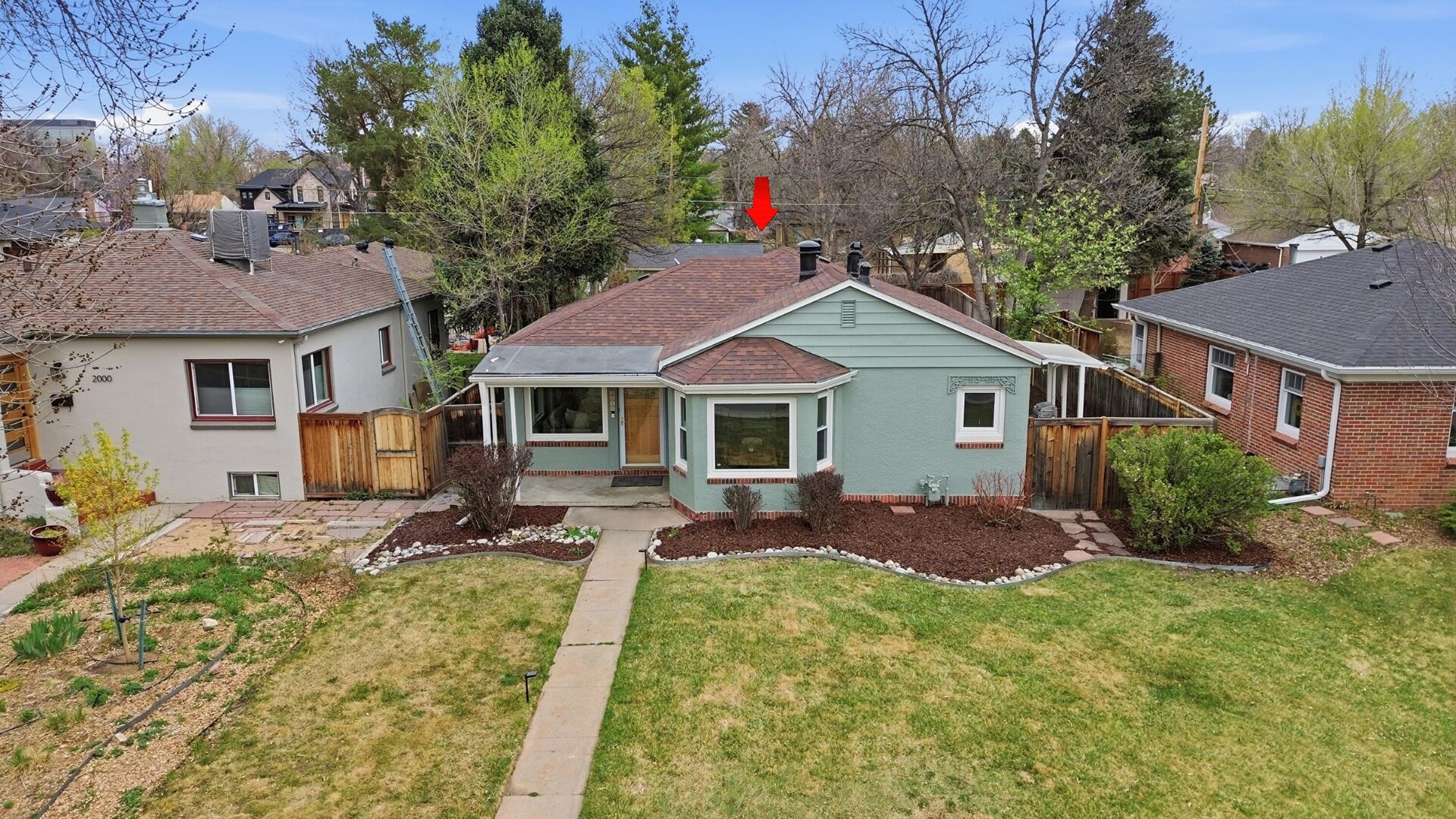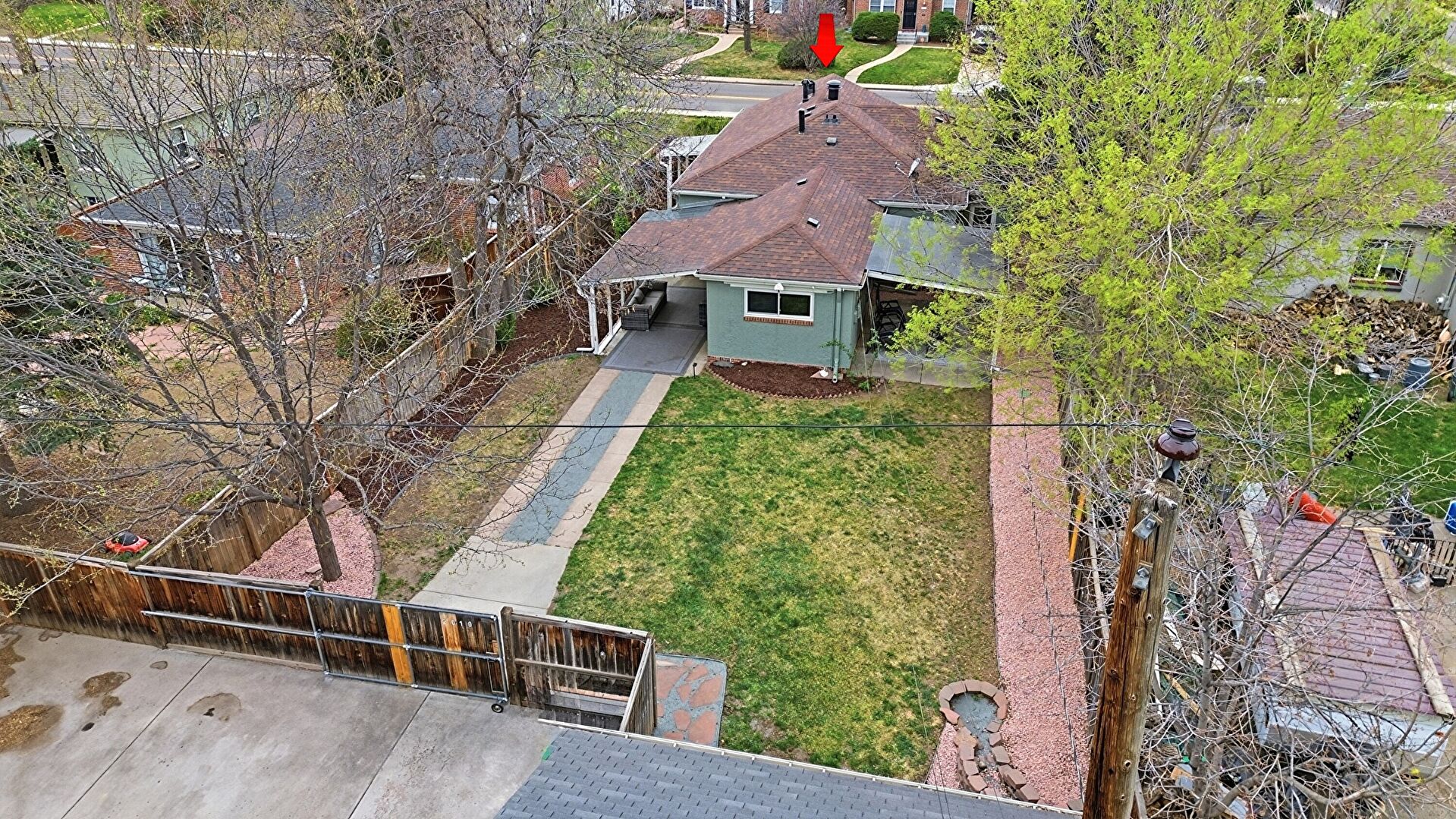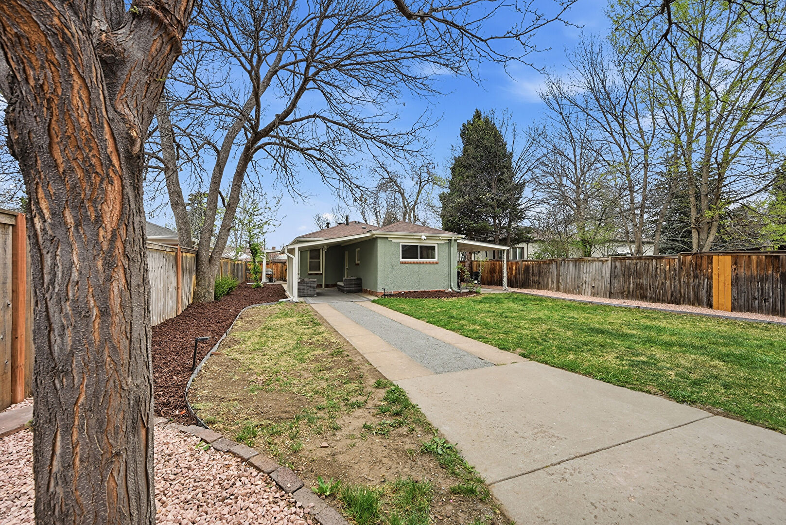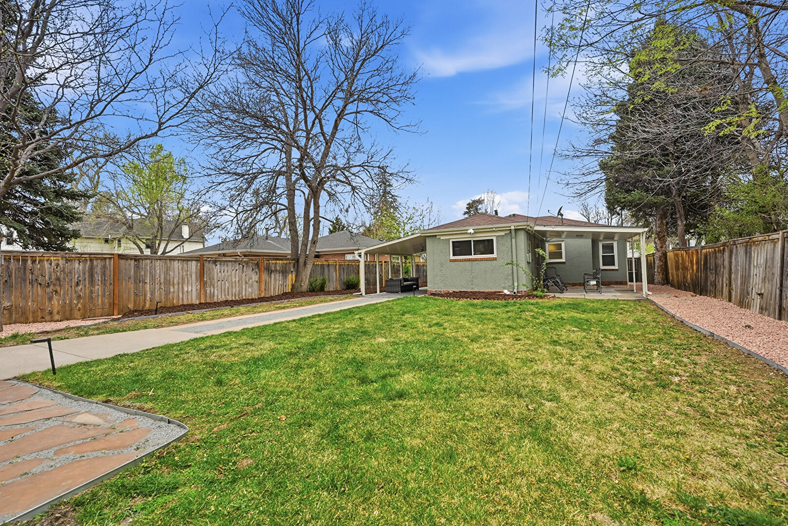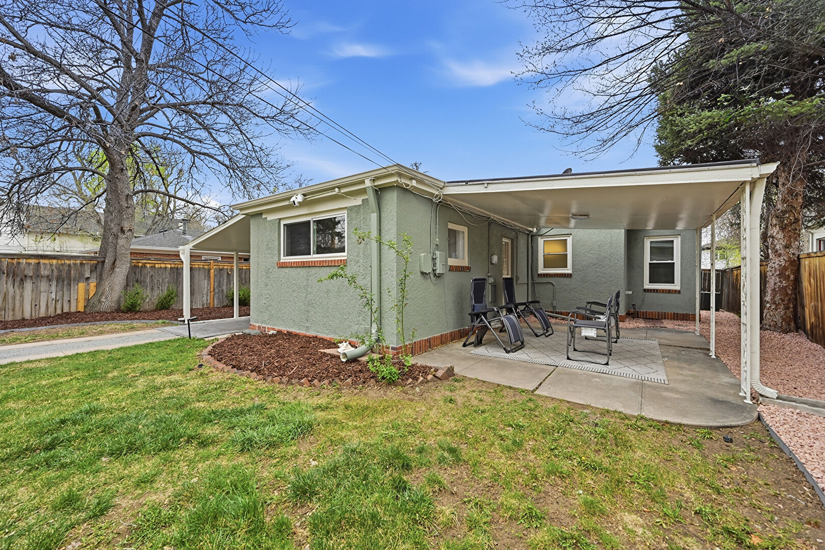 Attached Carport, Fence, Gutters, Lawn, Stucco Siding, Downspout, Parking Pad