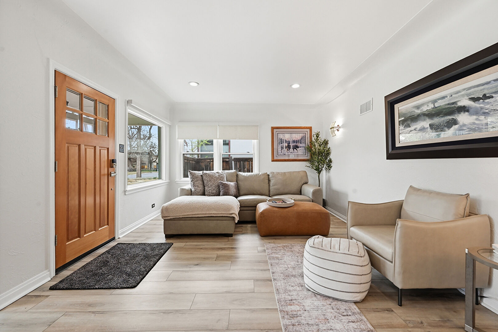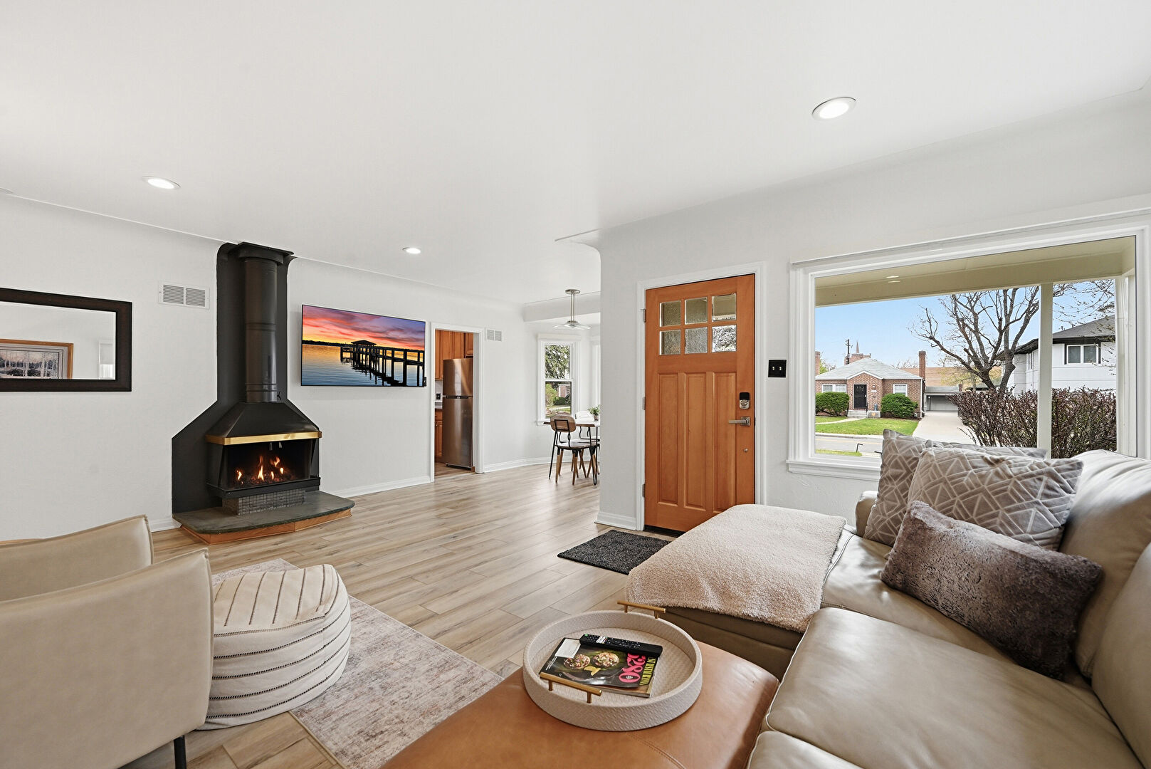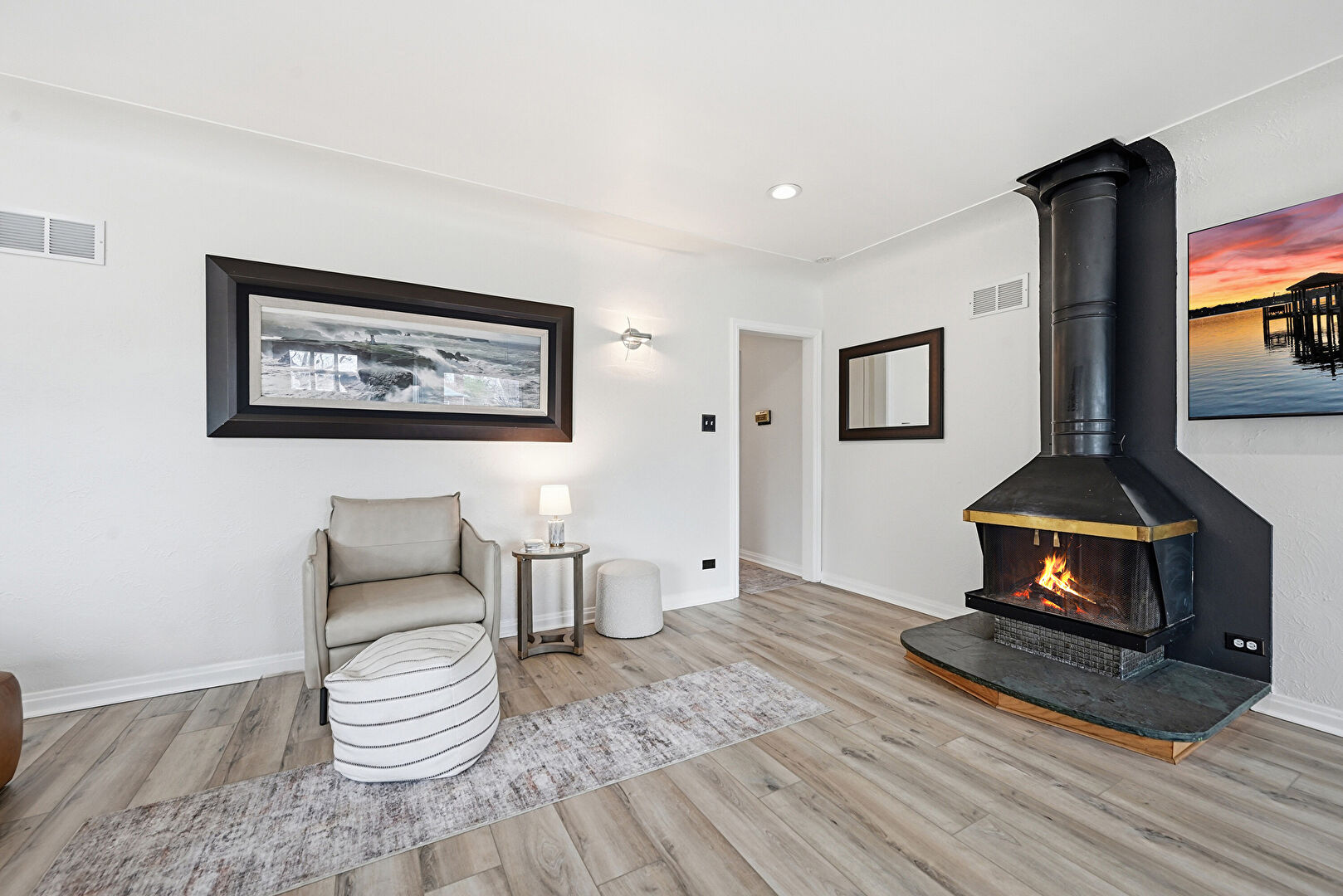 Baseboards Wall, Drywall, Natural Light, Recessed Lighting, Vent, Wood Finish Floor, Wood Stove, Drywall, Natural Light, Vent