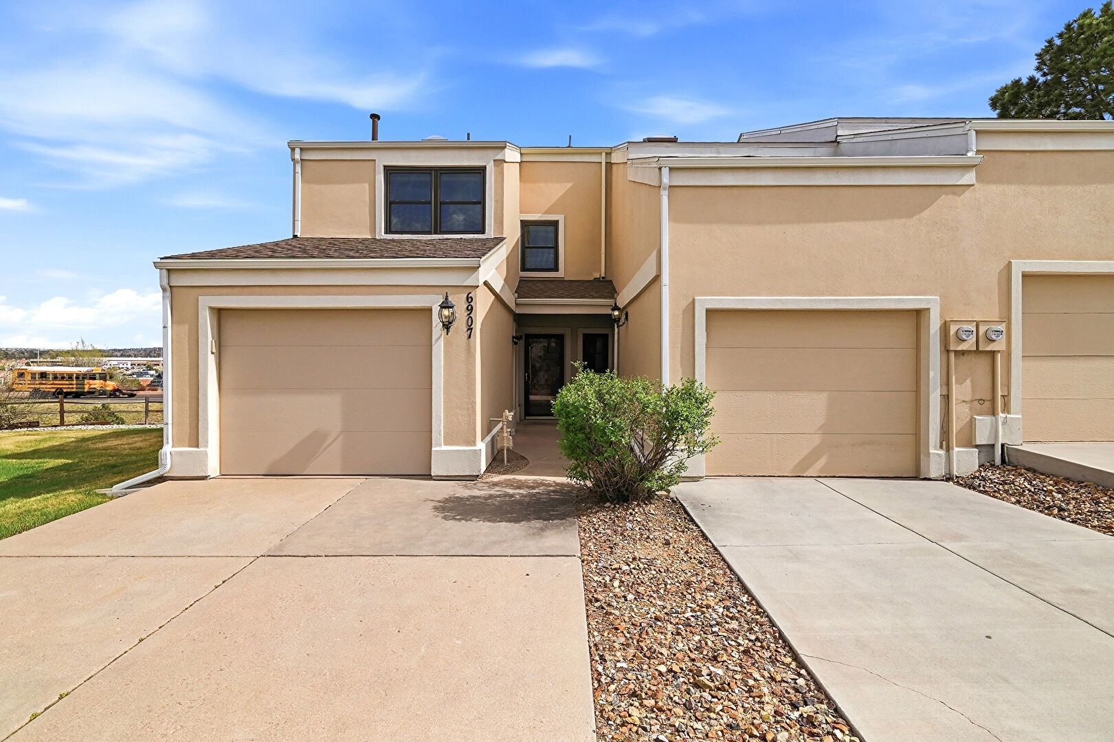 Built In Garage, Downspout, Driveway, Electric Meter, Gutters, Shingle Roof, Solar Panels, Stucco Siding, Garage, Shingle Roof