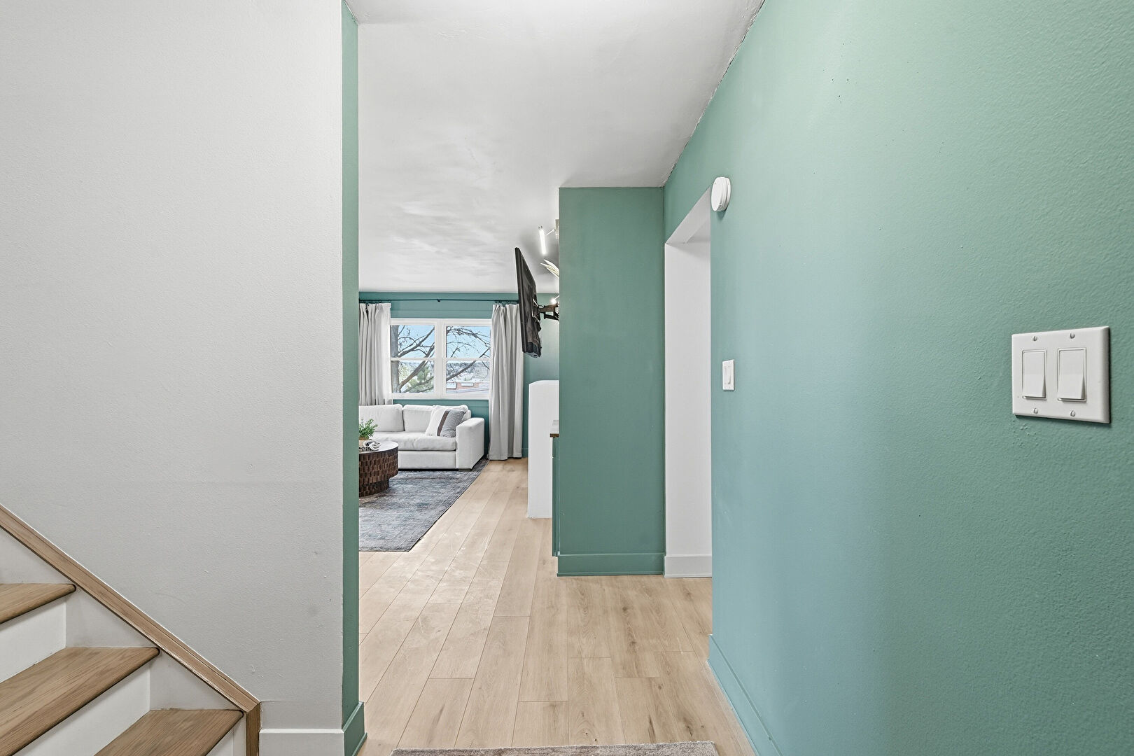 Baseboards Wall, Drywall, Natural Light, Smoke Carbon Monoxide Detector, Textured Wall, Wood Finish Floor, Stairs