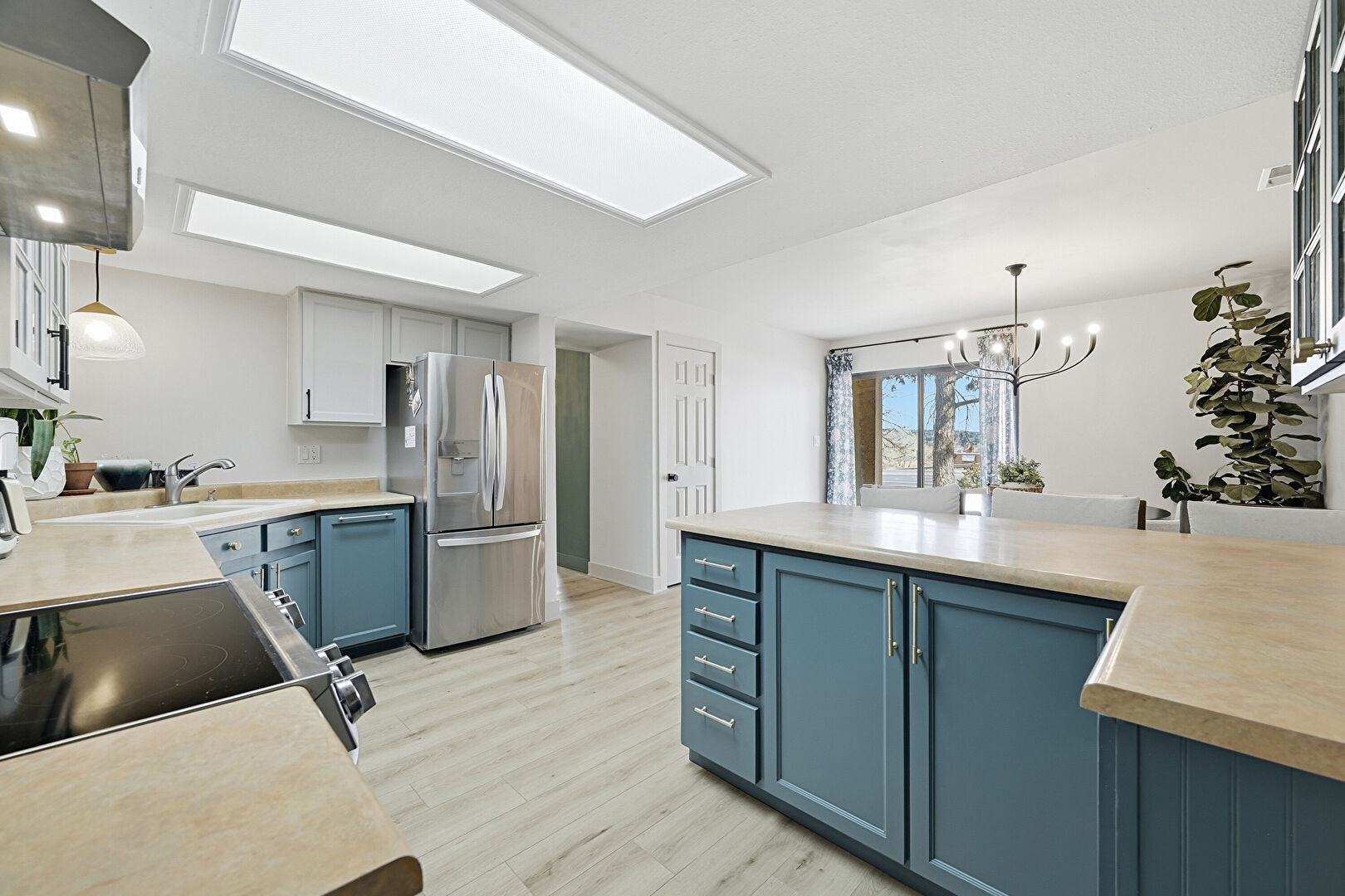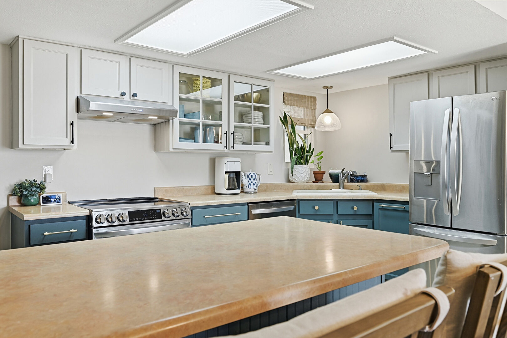Baseboards Wall, Blue Cabinets, Drywall, G Shaped Kitchen, Glass Insert Cabinets, Gray Cabinets, Kitchen Bar, Kitchen Peninsula, Natural Light, Notable Chandelier, Pendant Lighting, Shaker Cabinets, Skylight, Stone Countertops, Vent, Wood Finish Floor, G Shaped Kitchen, Kitchen Bar, Shaker Cabinets, Wood Finish Floor
