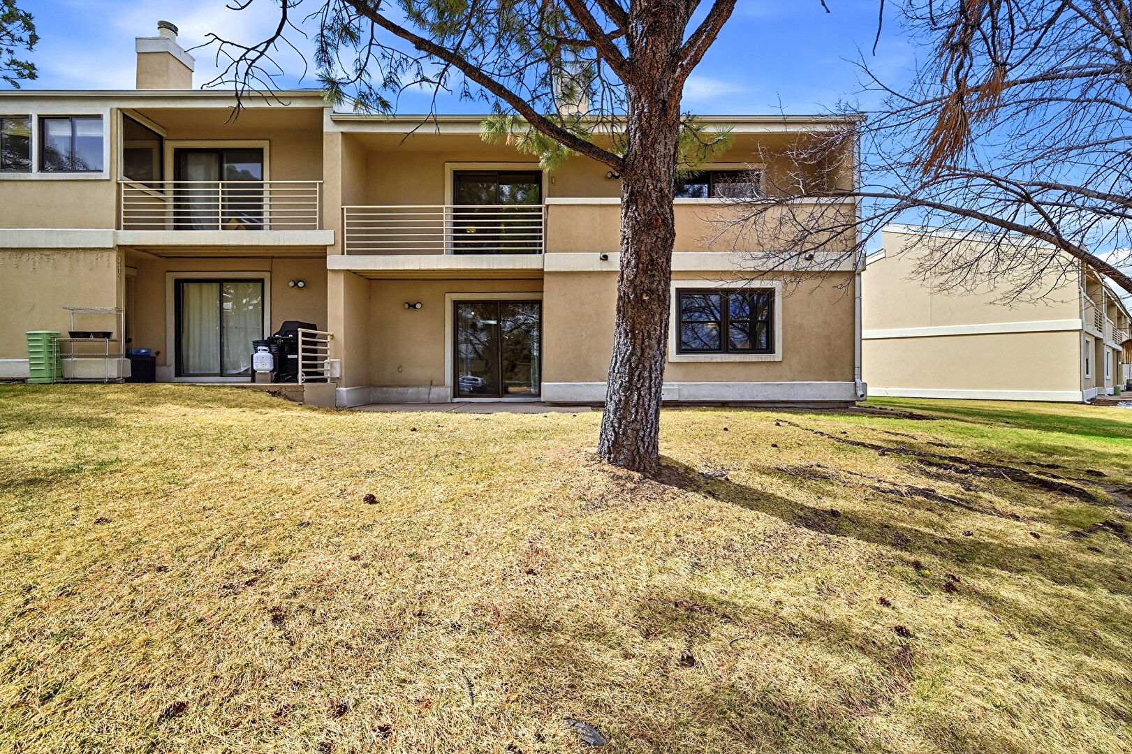 Balcony, Chimney, Concrete Foundation, Grill, Lawn, Patio, Stucco Siding, Lawn, Patio