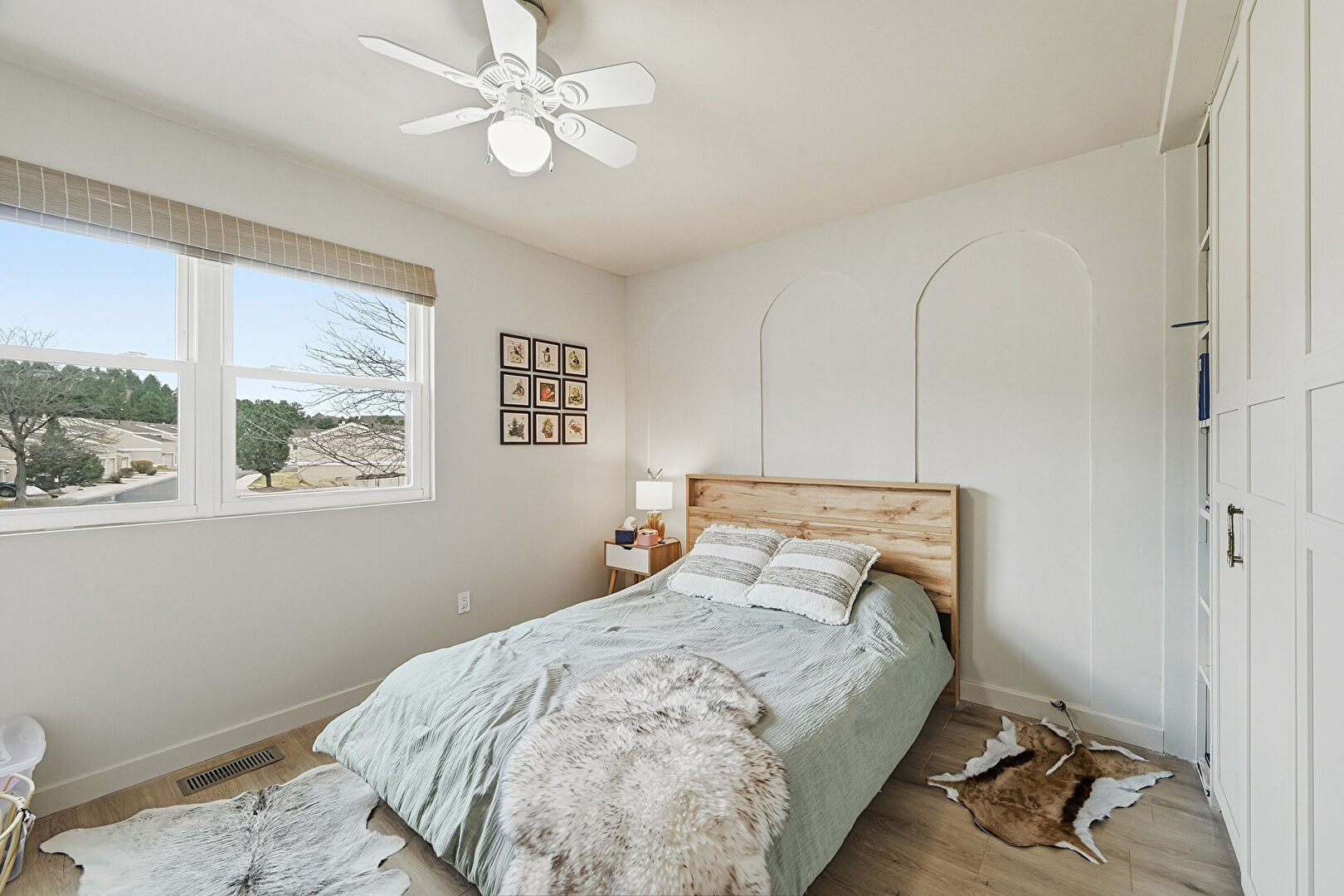 Baseboards Wall, Ceiling Fan, Drywall, Natural Light, Vent, Wood Finish Floor, Crown Molding, Natural Light