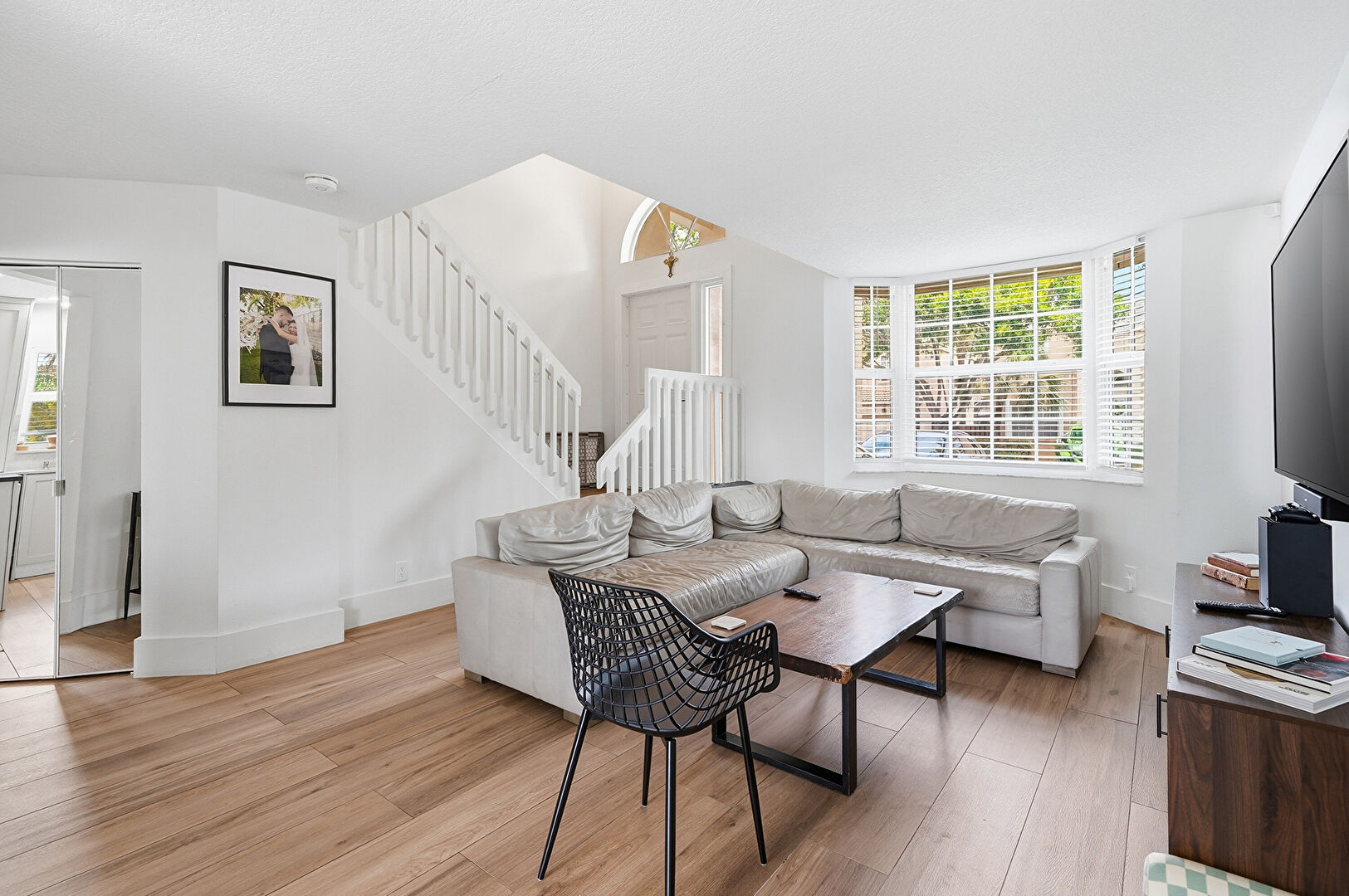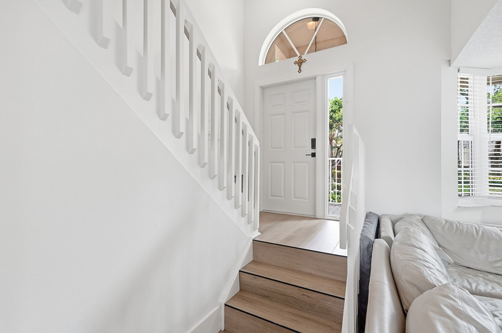Drywall, Natural Light, Stairs, Wood Finish Floor, High Ceiling