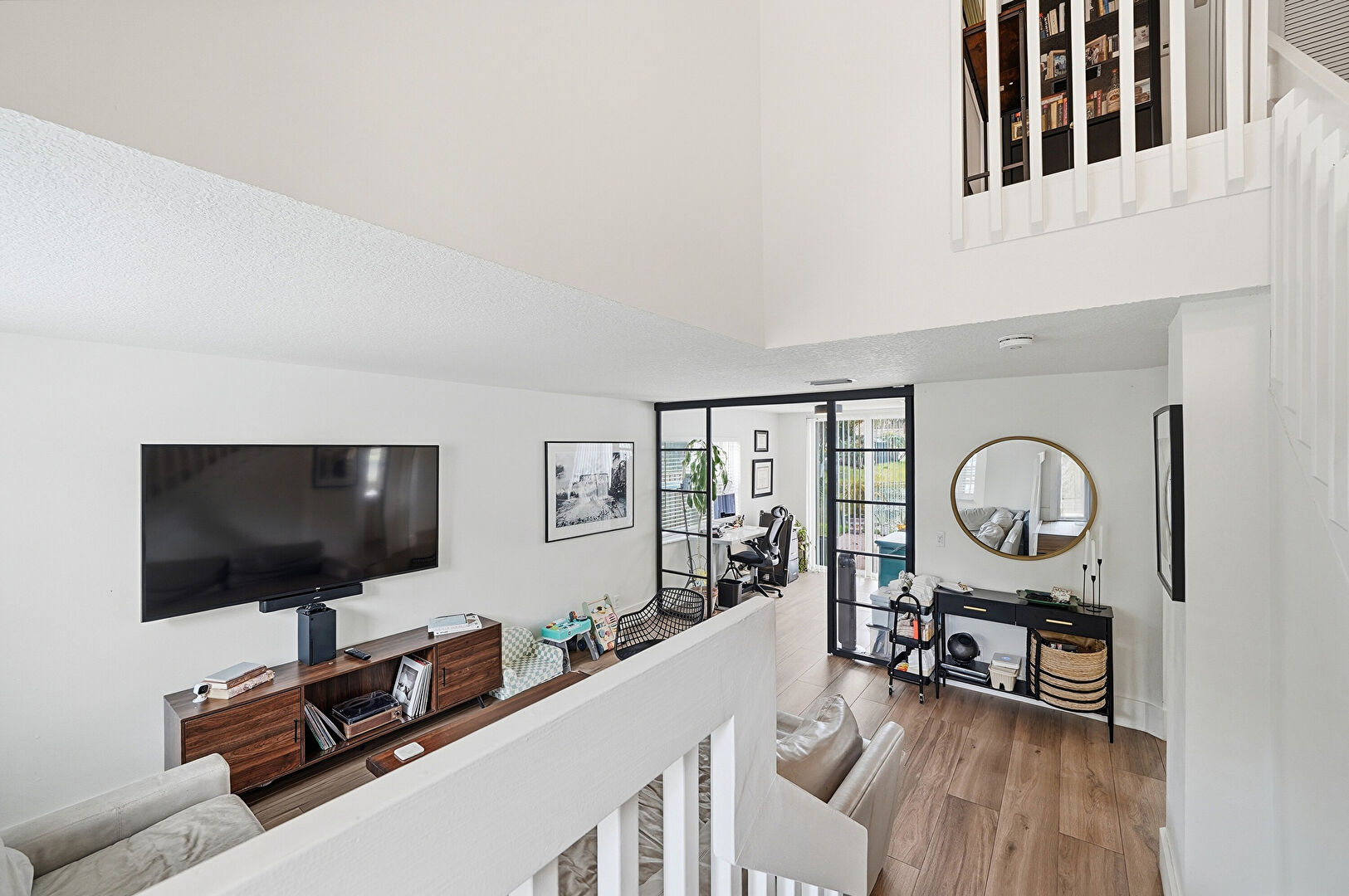 Baseboards Wall, Drywall, Floor Ceiling Windows, High Ceiling, Natural Light, Office Area, Stairs, Textured Ceiling, Vent, Wood Finish Floor, Natural Light, Smoke Carbon Monoxide Detector, Textured Ceiling