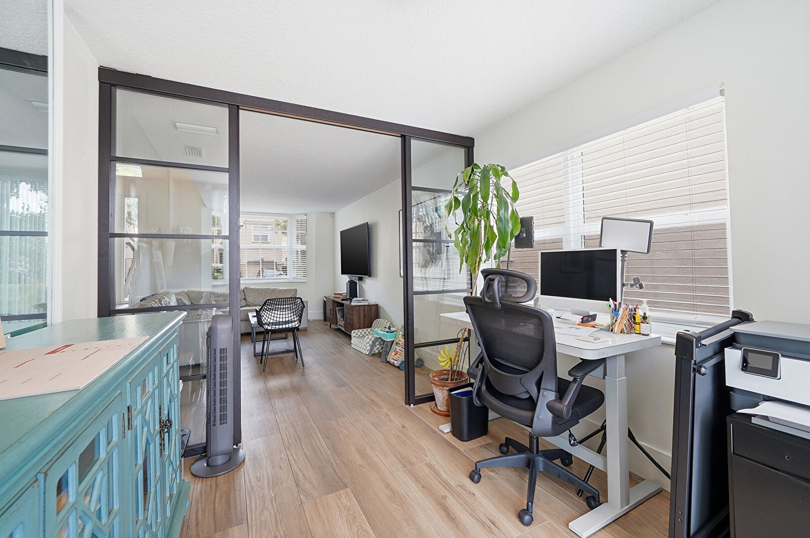 Drywall, Natural Light, Office Area, Vent, Wood Finish Floor, Natural Light, Textured Ceiling