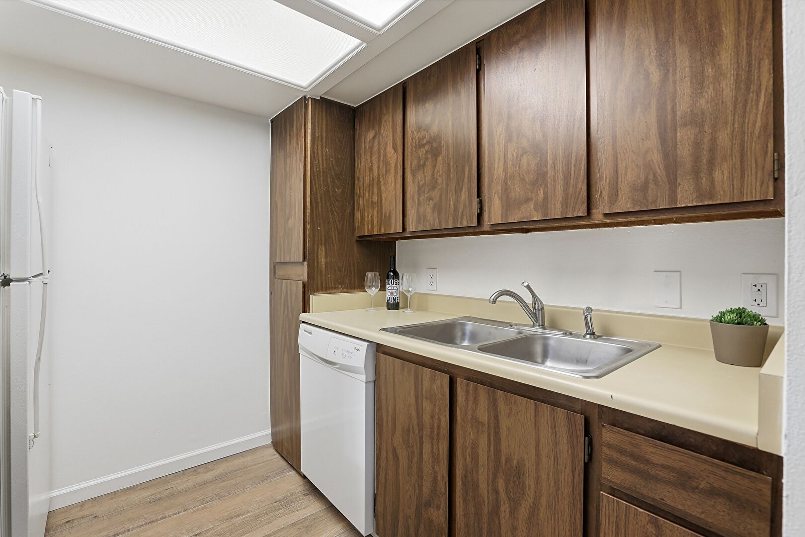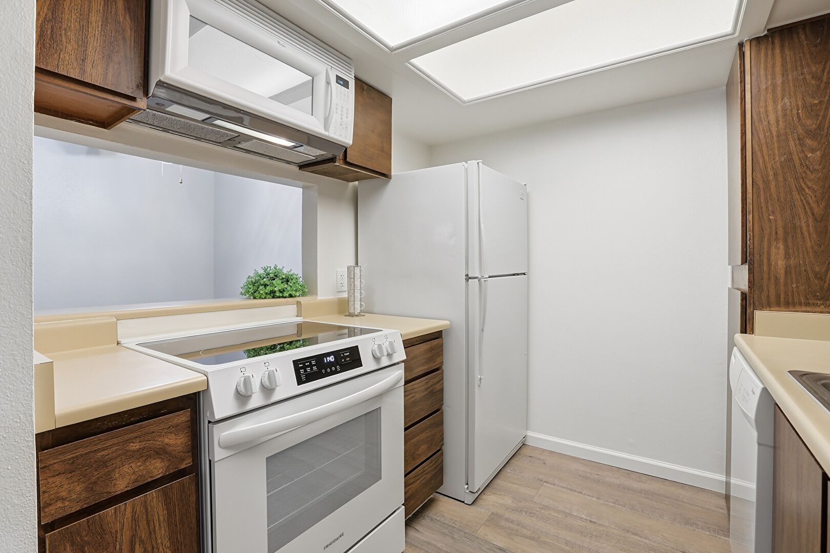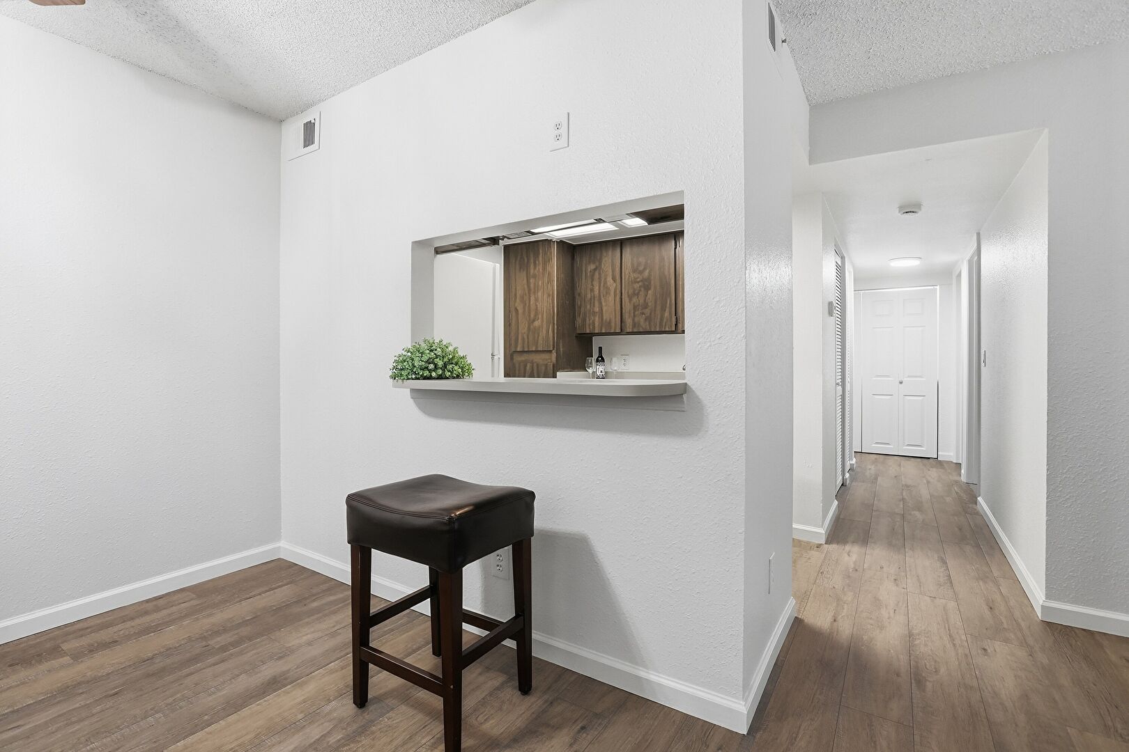 Baseboards Wall, Dark Brown Cabinets, Drywall, Medium Brown Cabinets, Visible Hinge Cabinets, Wood Finish Floor, Baseboards Wall, Dark Brown Cabinets, Pass Through Window