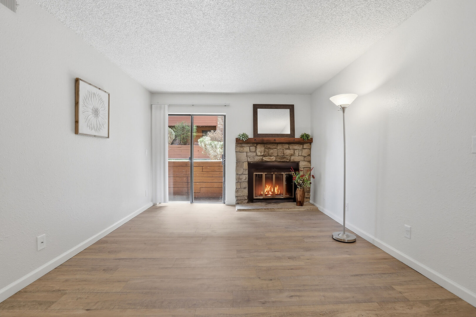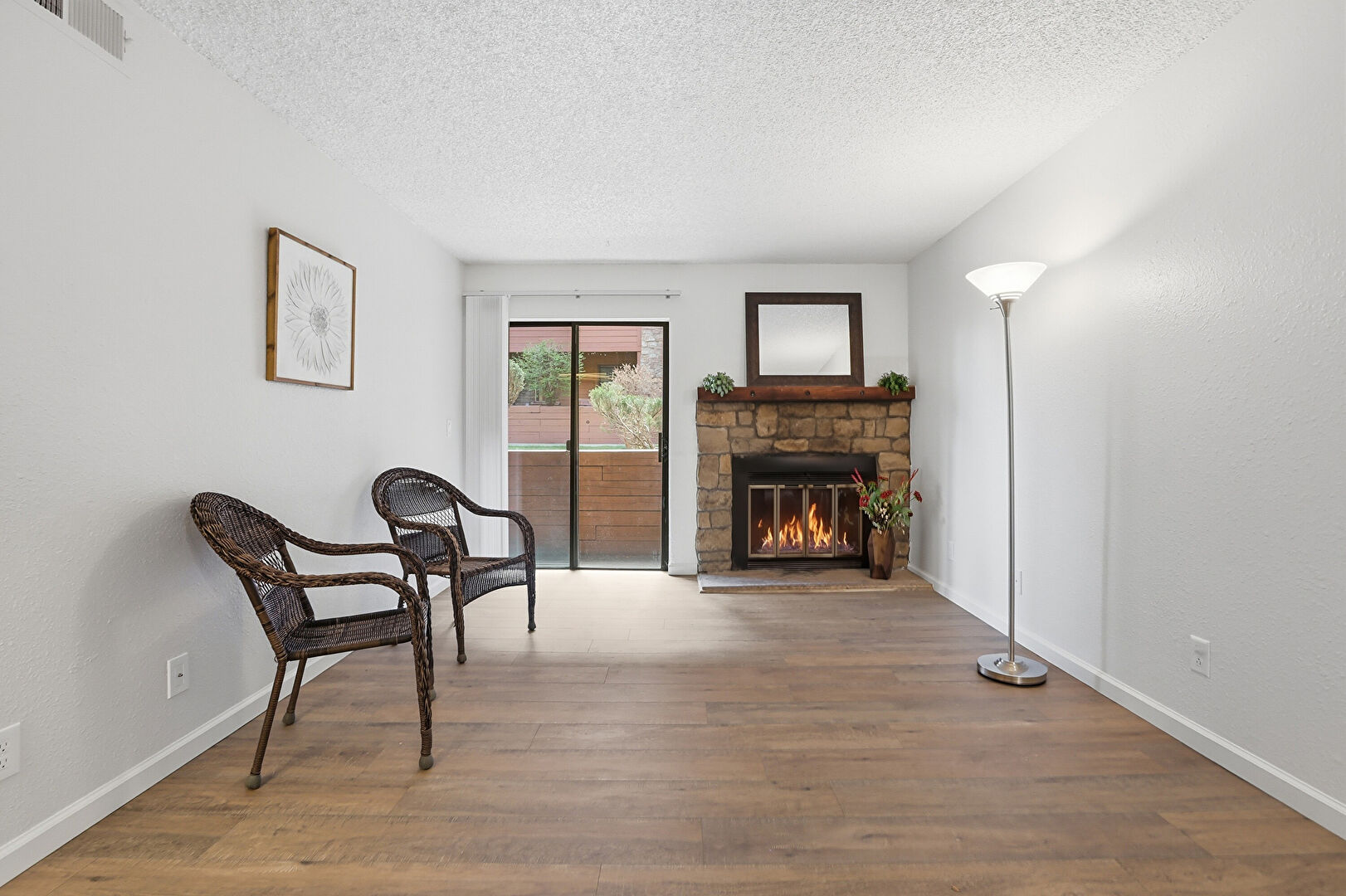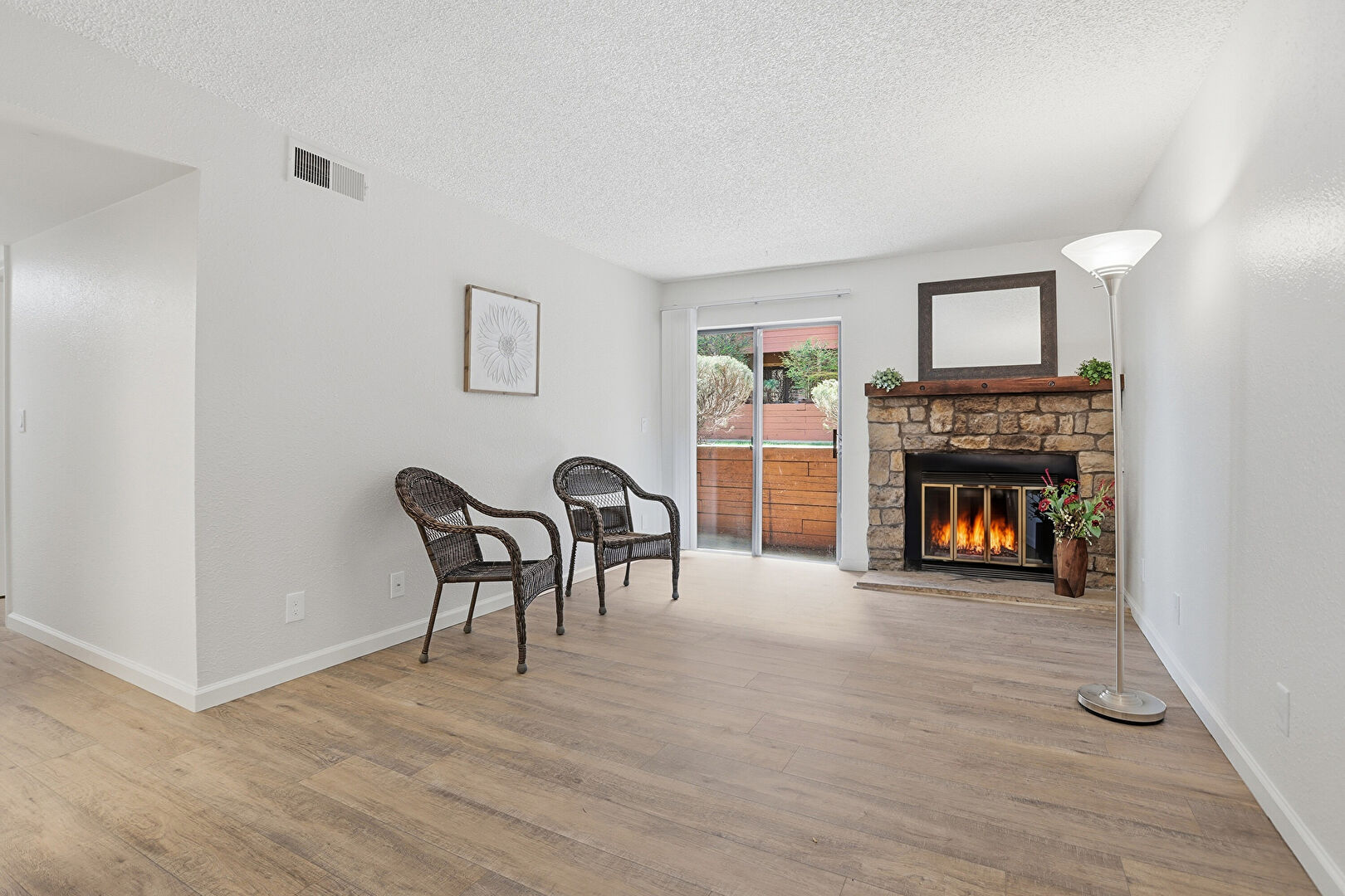 Baseboards Wall, Ceiling Fan, Drywall, Fireplace, Natural Light, Textured Ceiling, Textured Wall, Vent, Wood Finish Floor, Baseboards Wall, Drywall, Natural Light, Textured Wall, Wood Finish Floor