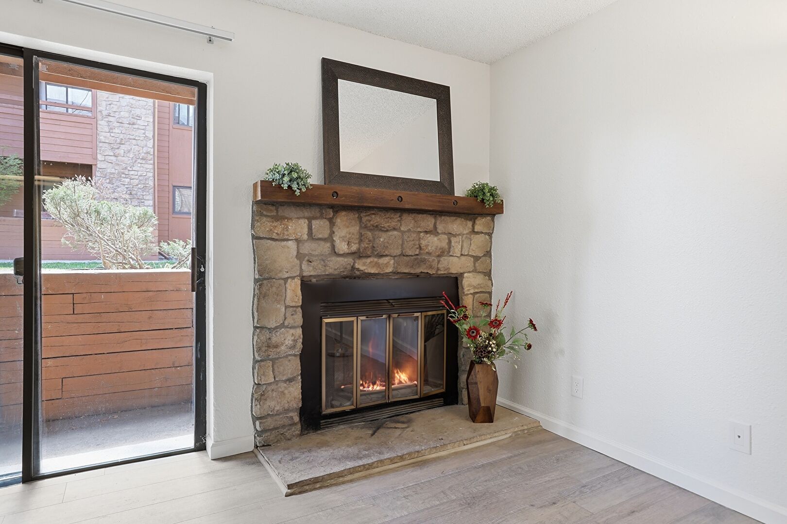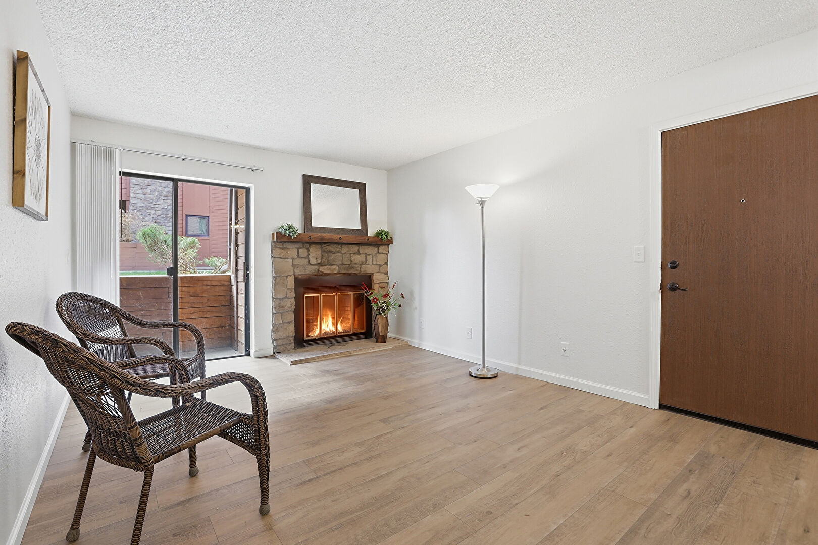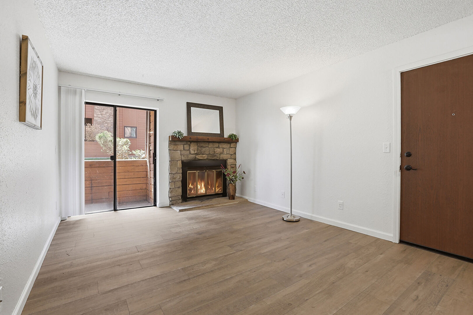 Baseboards Wall, Ceiling Fan, Drywall, Fireplace, Natural Light, Textured Ceiling, Textured Wall, Vent, Wood Finish Floor, Baseboards Wall, Drywall, Natural Light, Textured Wall, Wood Finish Floor