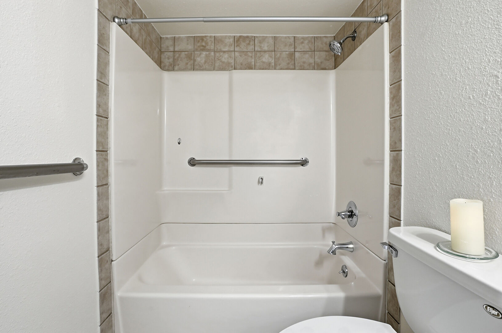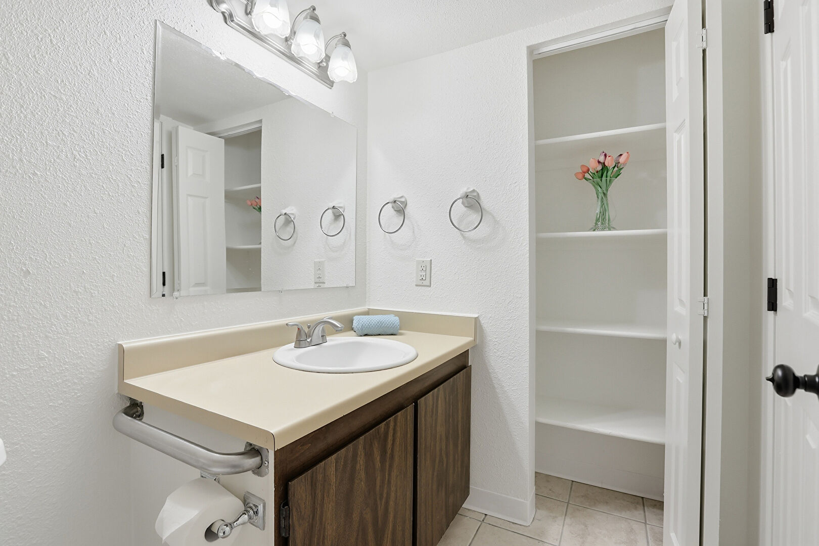 Baseboards Wall, Closet, Combined Bath Shower, Full Bathroom, Textured Wall, Tile Floor, Vanity, Vent, Combined Bath Shower, Full Bathroom, Textured Wall