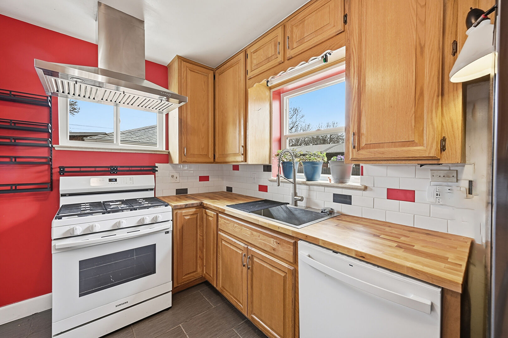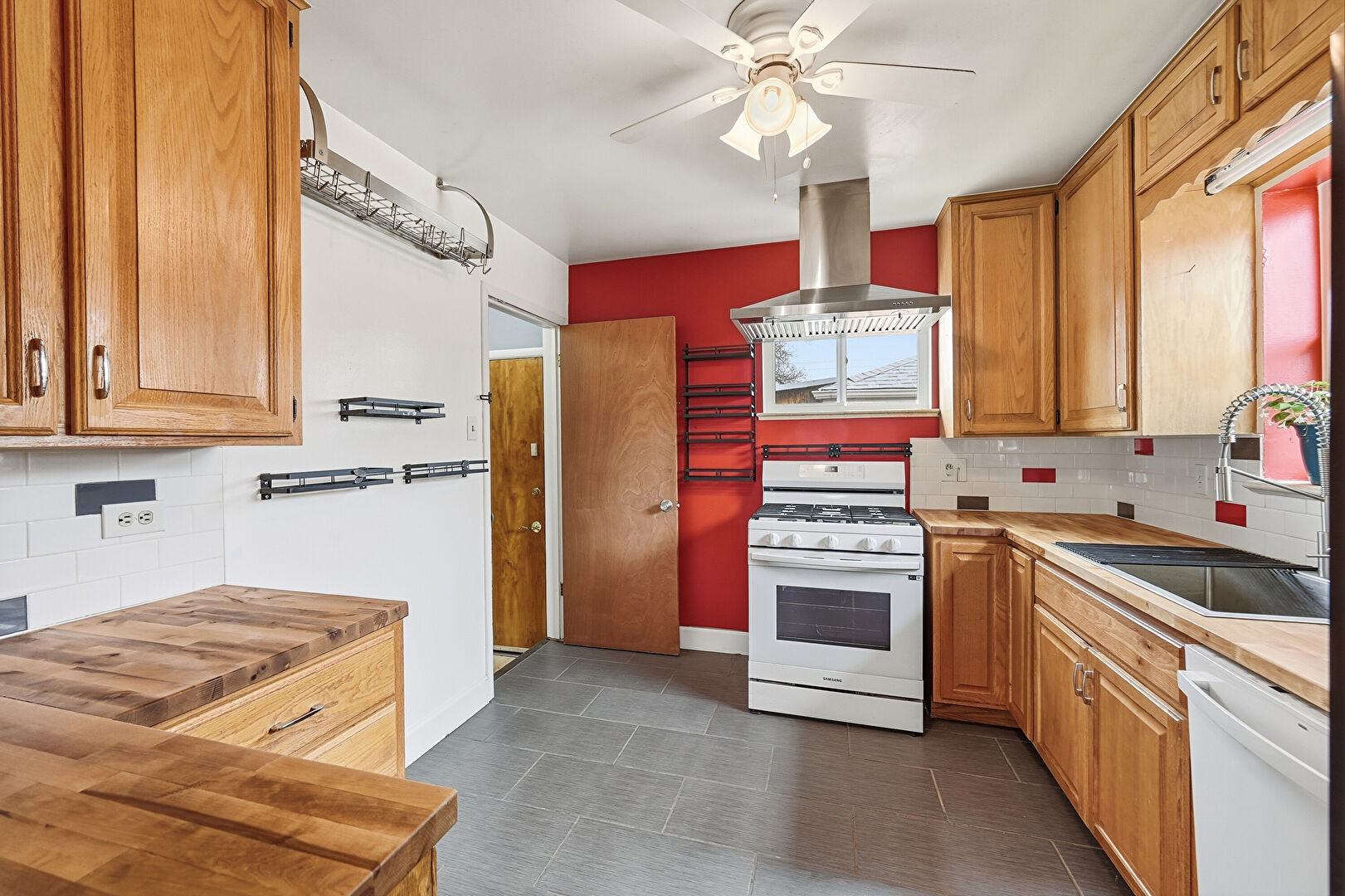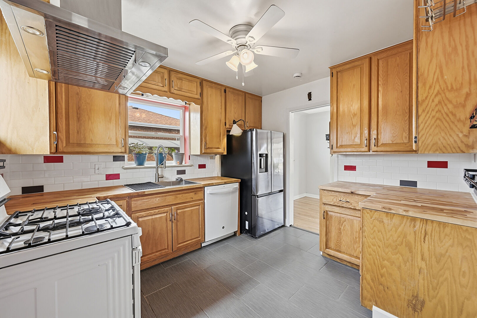 Baseboards Wall, Butcher Block Countertops, Ceiling Fan, Drywall, Medium Brown Cabinets, Natural Light, Raised Cabinets, Tile Floor, Vinyl Floor, Visible Hinge Cabinets, Natural Light, Raised Cabinets, Visible Hinge Cabinets