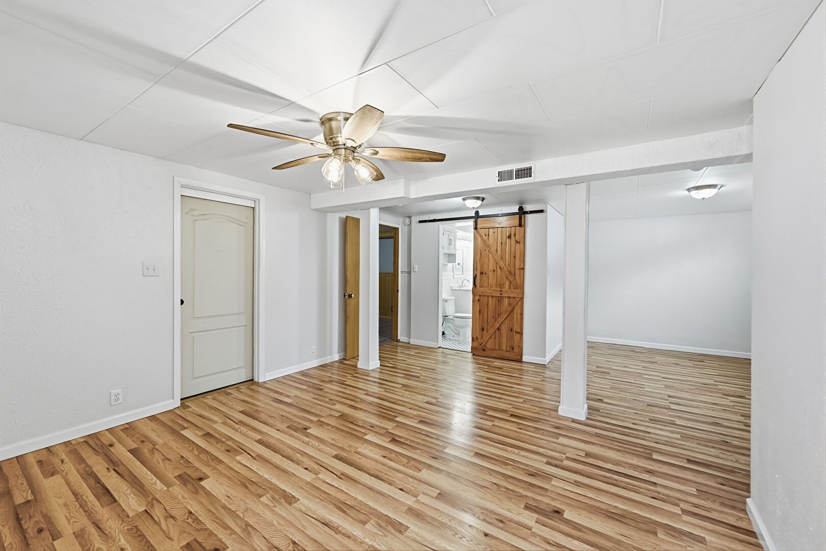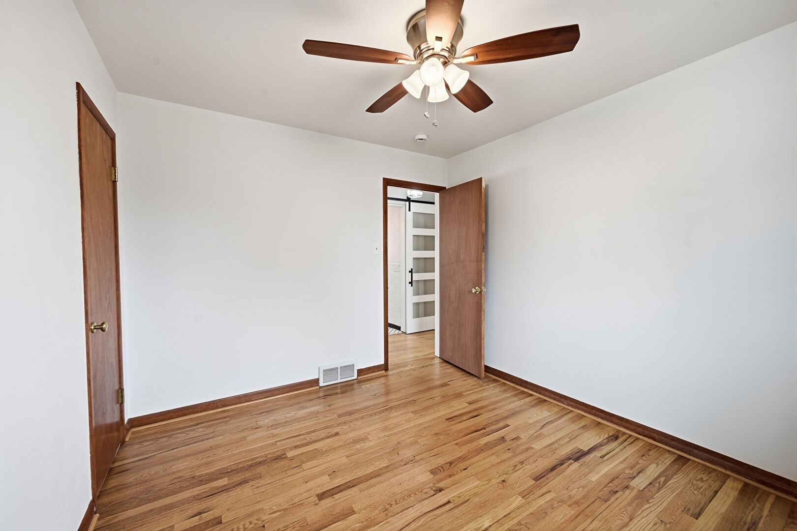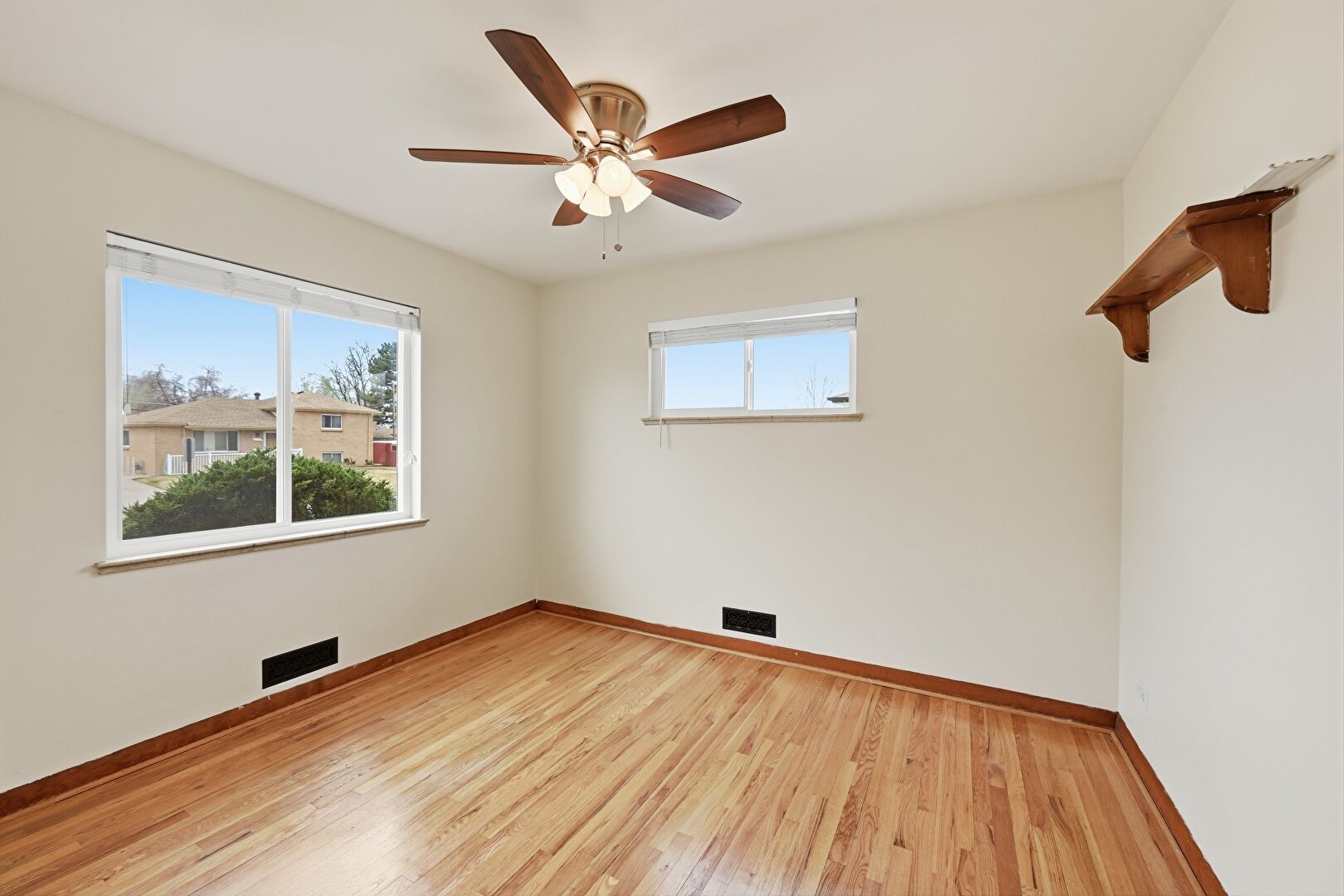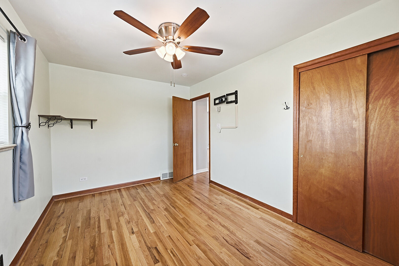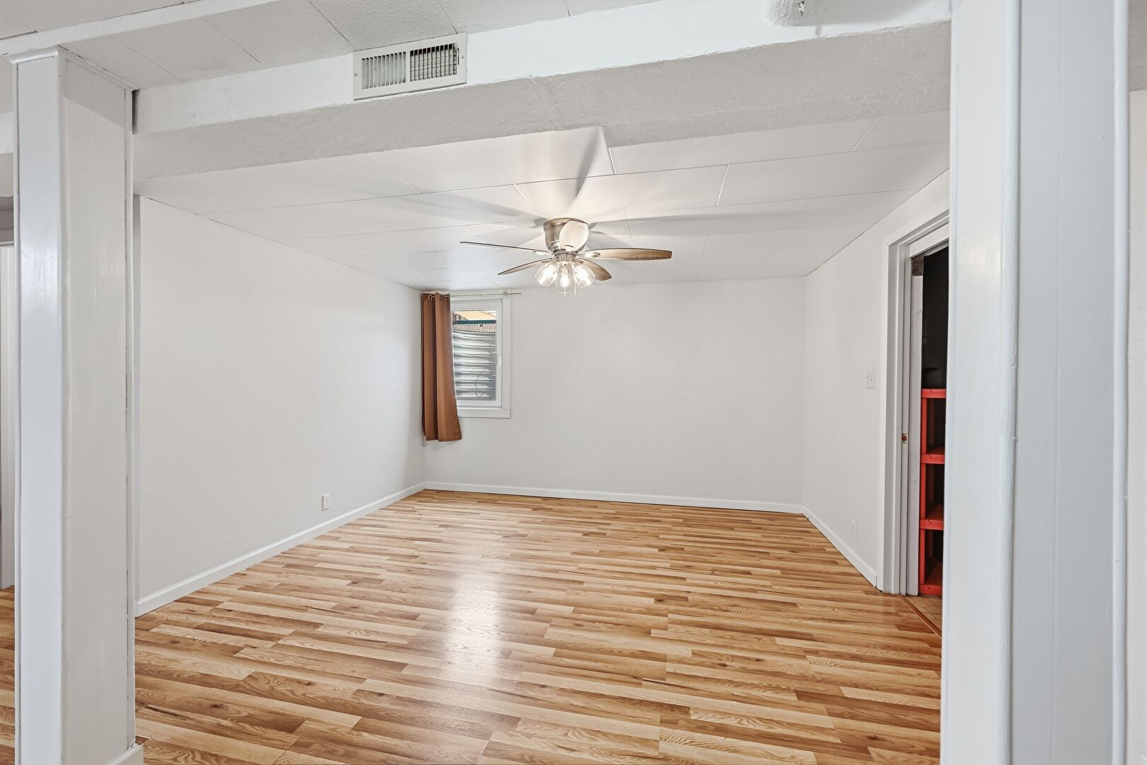 Baseboards Wall, Ceiling Fan, Drywall, Natural Light, Vent, Wood Finish Floor