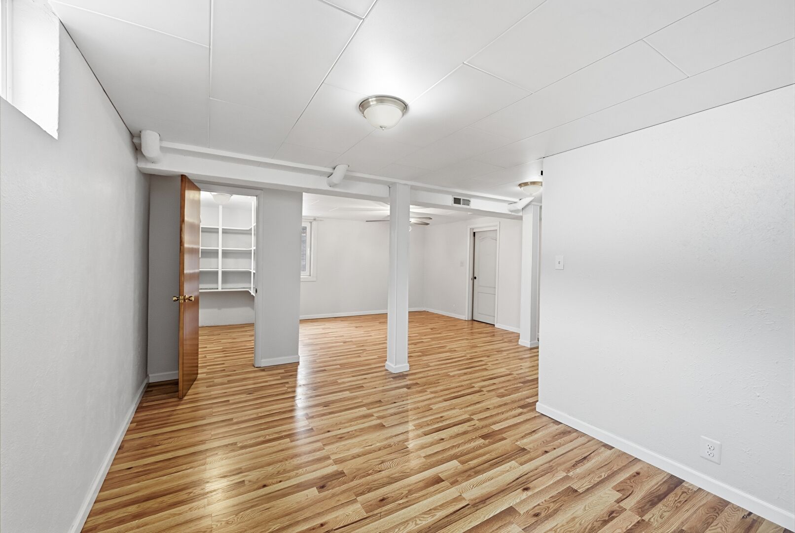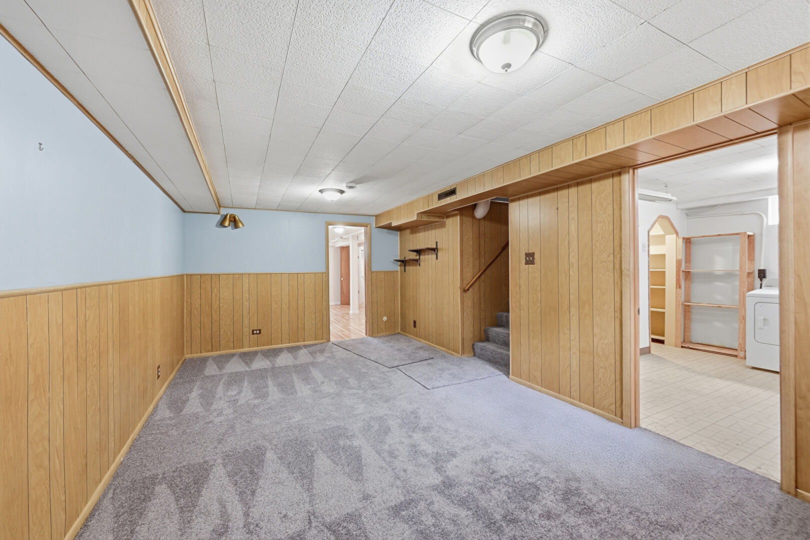 Barn Door, Baseboards Wall, Basement, Carpet, Ceiling Fan, Drywall, Ensuite Bathroom, Laundry, Natural Light, Smoke Carbon Monoxide Detector, Stairs, Vent, Wainscot Wall, Washer Dryer, Wood Finish Floor, Wood Wall, Basement, Carpet, Ceiling Fan, Natural Light, Wainscot Wall, Wood Finish Floor