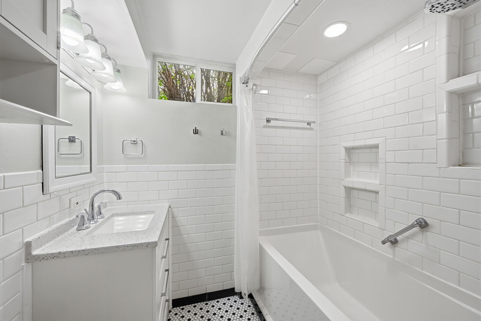 Combined Bath Shower, Drywall, Full Bathroom, Natural Light, Recessed Lighting, Tile Floor, Tile Wall, Vanity, Vent, Wainscot Wall, Drywall, Vanity