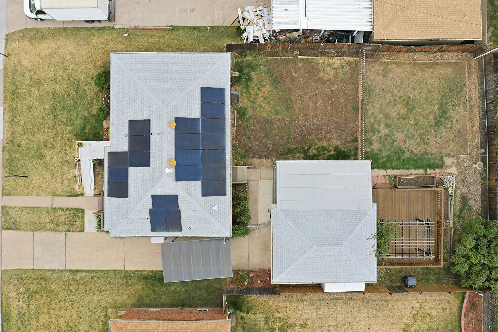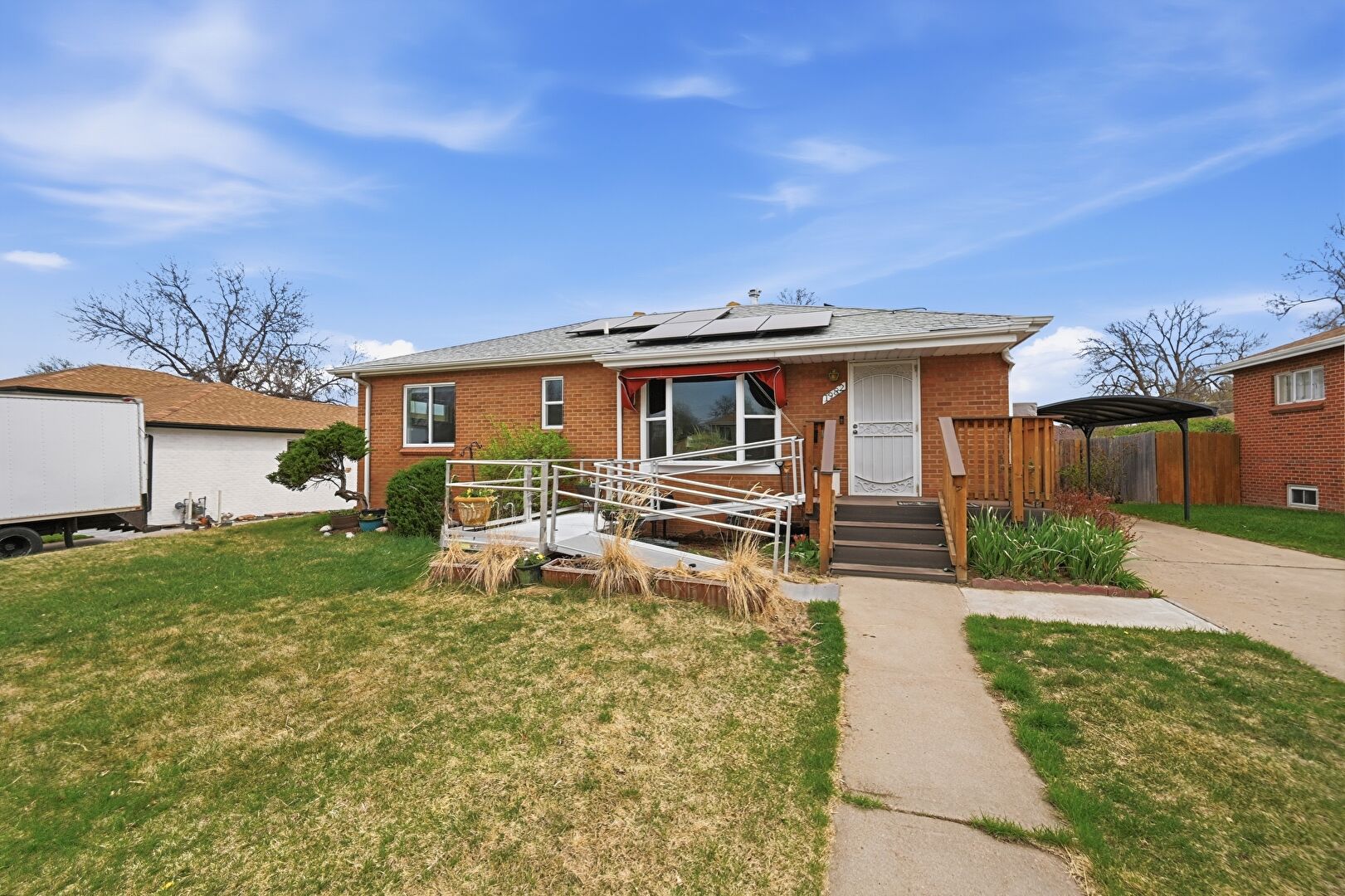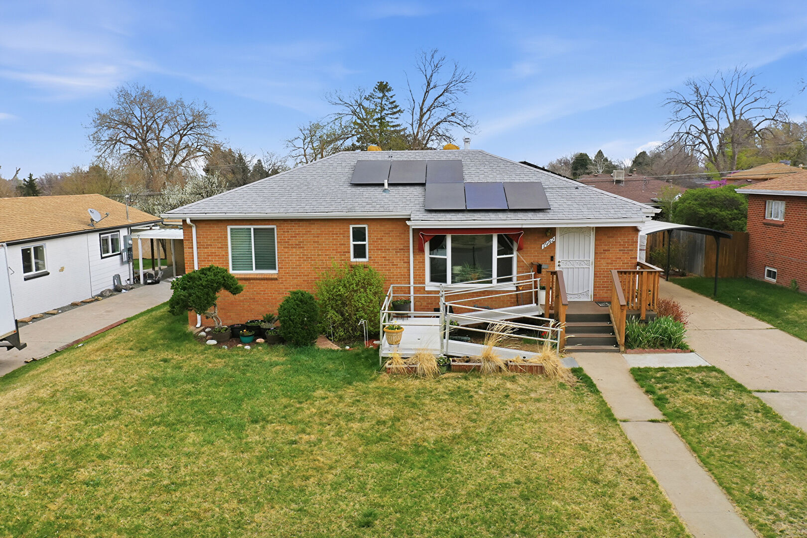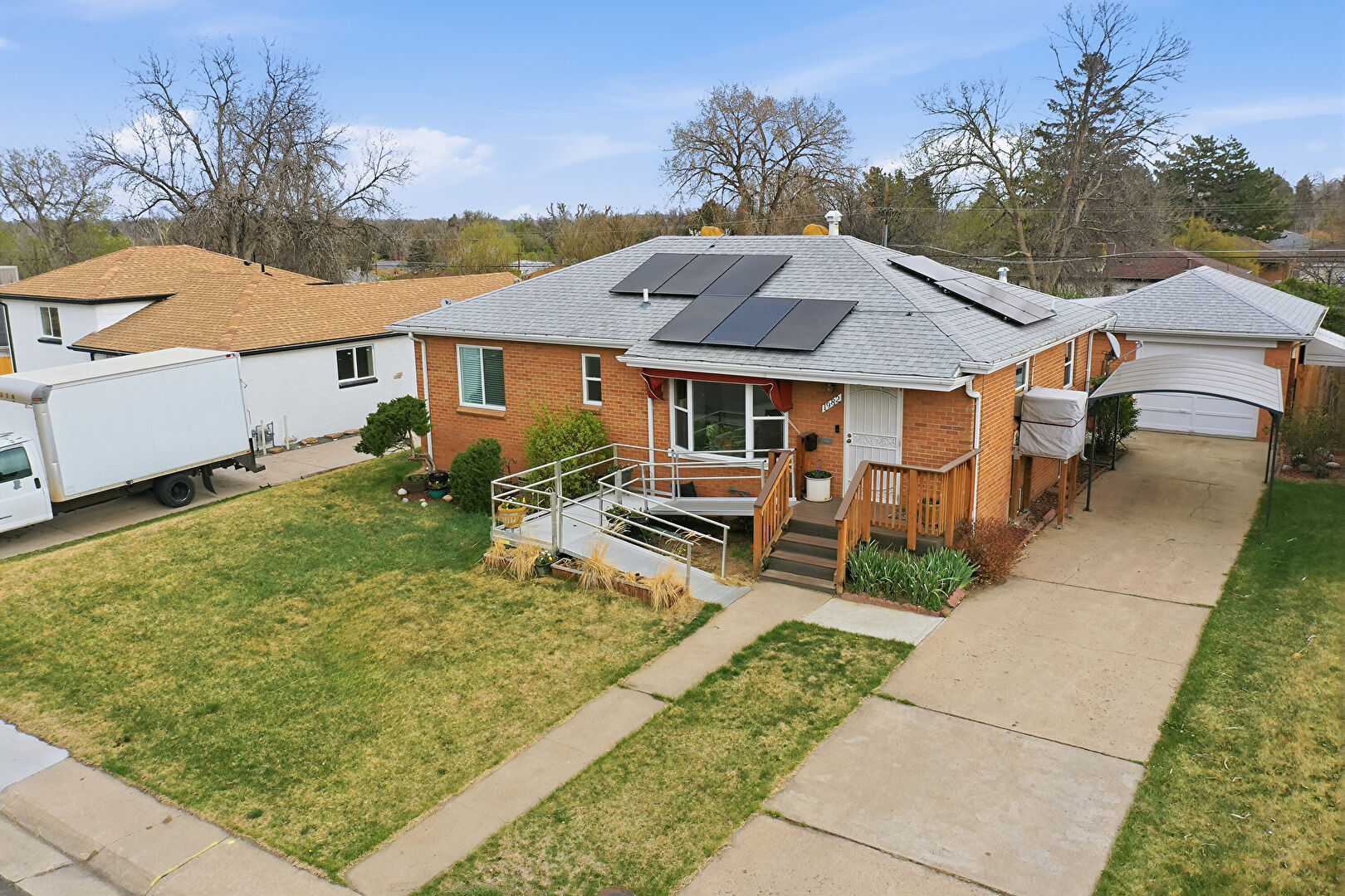Awning, Brick Siding, Deck, Detached Garage, Downspout, Driveway, Garage, Gutters, Lawn, Outdoor Structure, Shingle Roof, Solar Panels, Stairs, Stoop, Deck, Detached Carport, Gutters, Shingle Roof