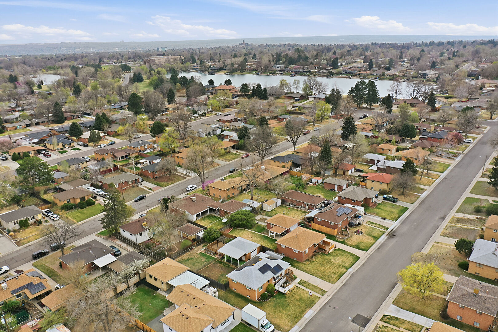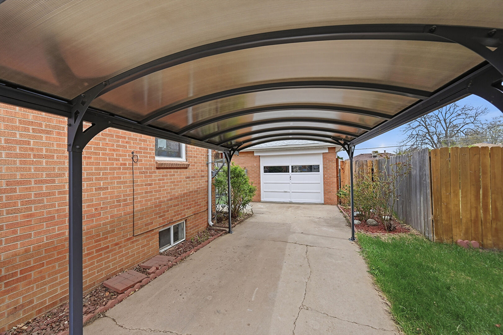 Brick Siding, Deck, Downspout, Driveway, Fence, Garden, Gate, Gutters, Lawn, Patio, Residential View, Rolled Roof, Satellite Dish, Shingle Roof, Solar Panels, Parking Pad, Satellite Dish