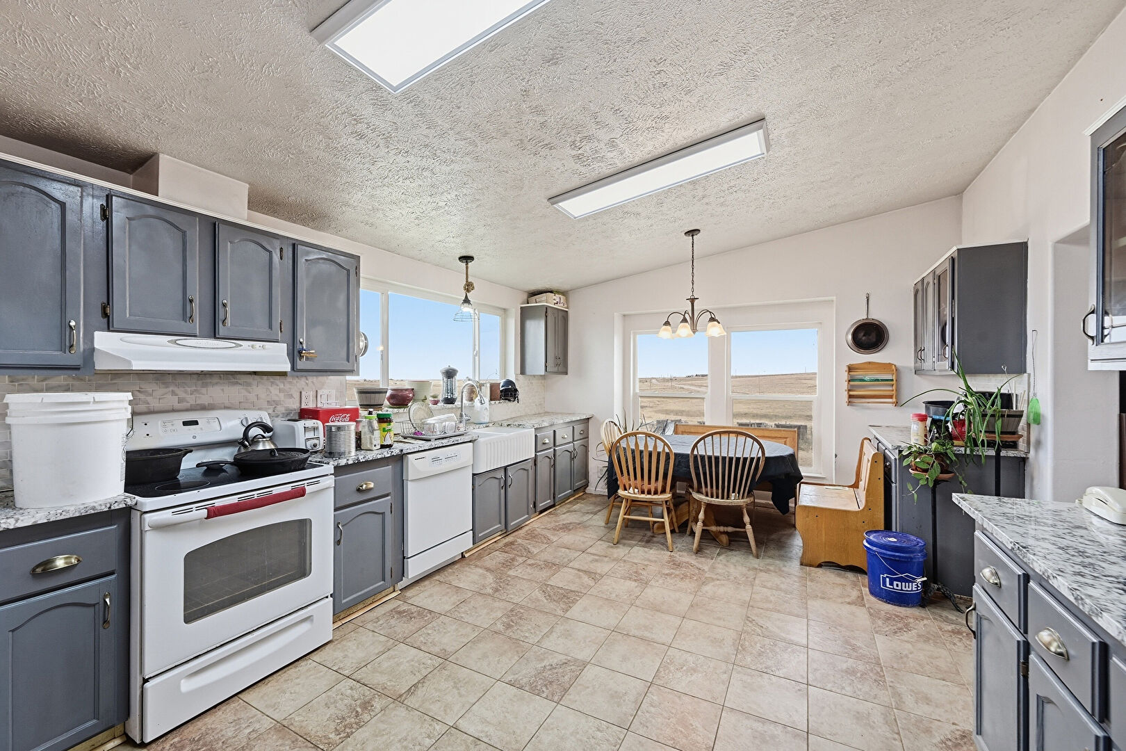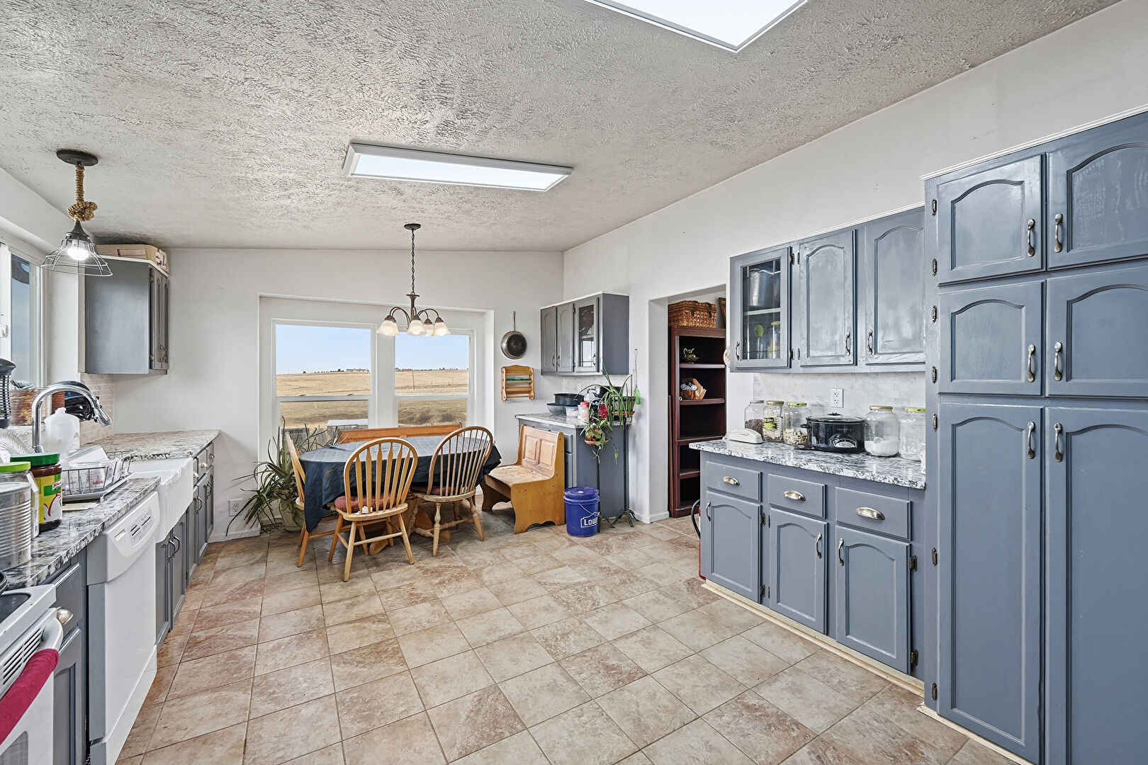Arched Cabinets, Blue Cabinets, Drywall, Glass Insert Cabinets, Gray Cabinets, Laundry, Natural Light, Notable Chandelier, Pendant Lighting, Shaker Cabinets, Skylight, Stone Countertops, Textured Ceiling, Toaster, Vaulted Ceiling, Visible Hinge Cabinets, Arched Cabinets, Shaker Cabinets