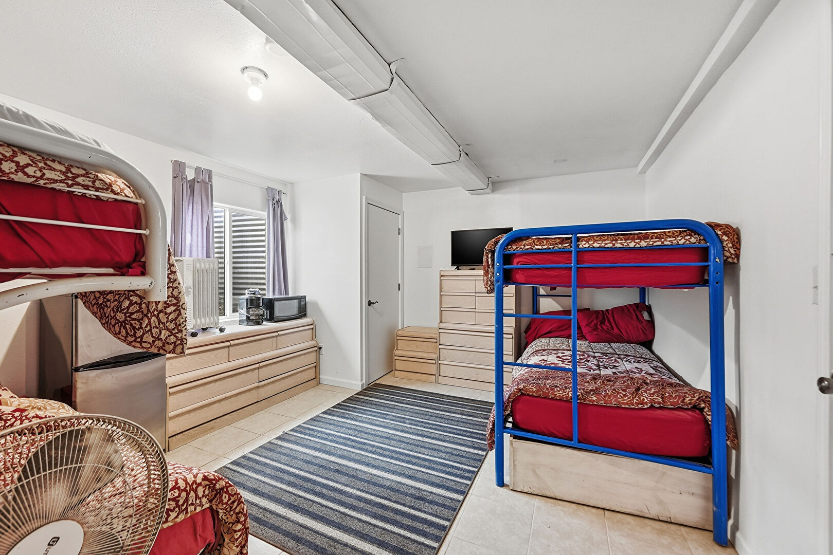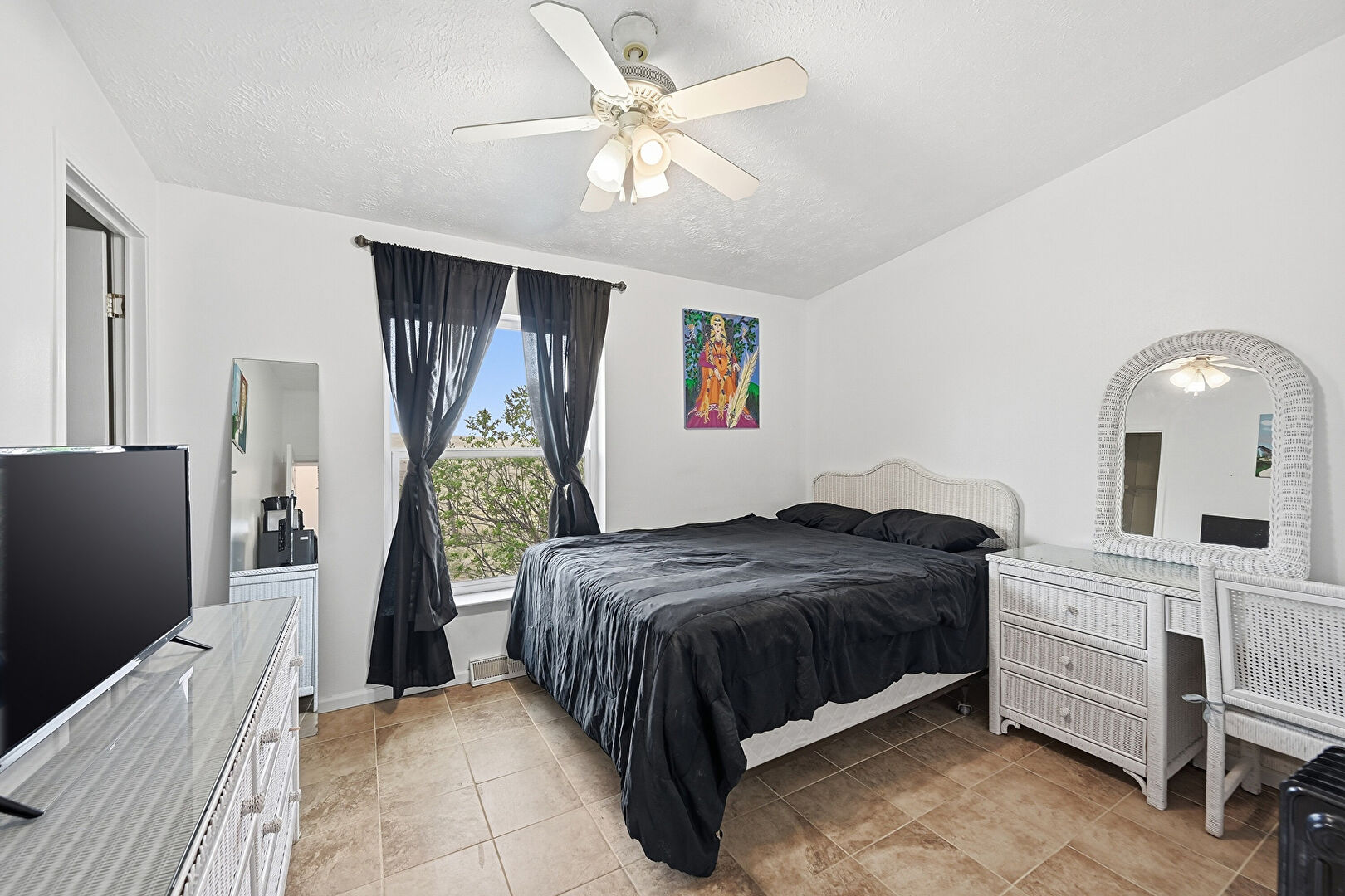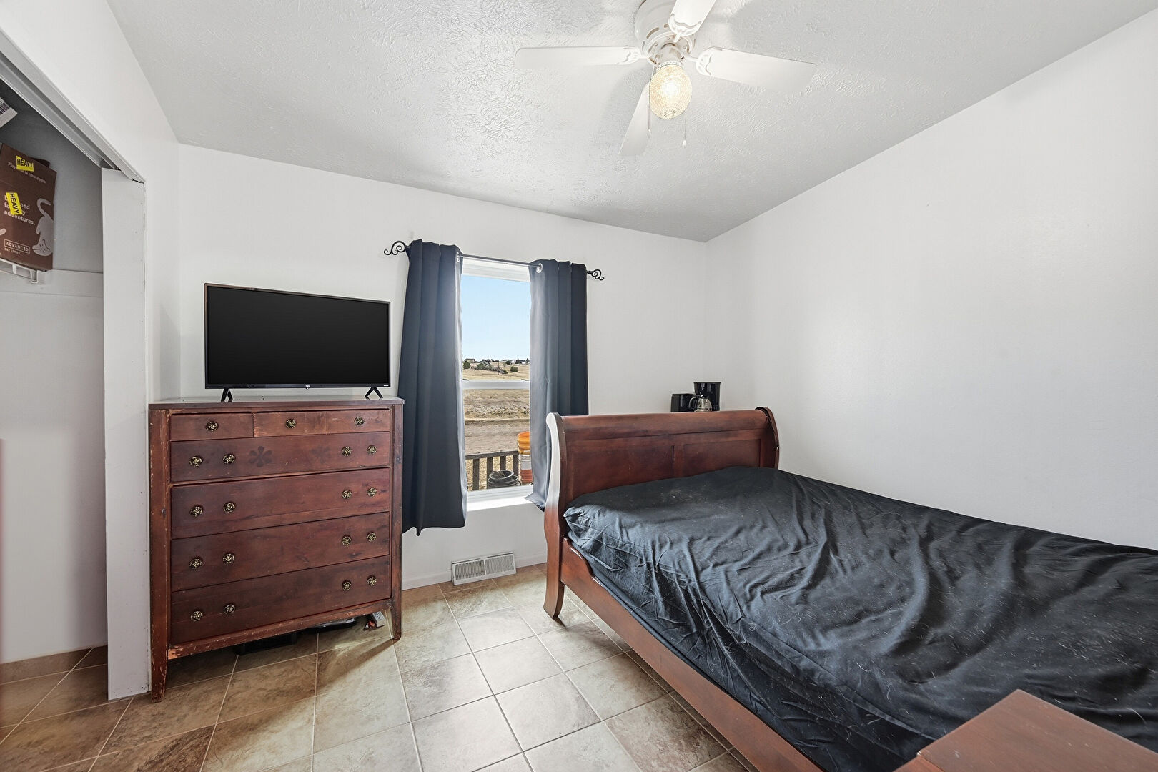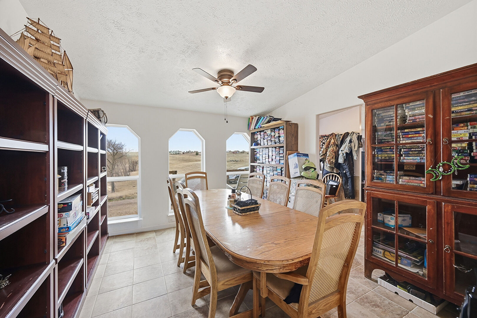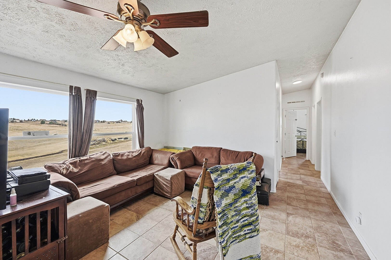 Ceiling Fan, Drywall, Natural Light, Rural View, Textured Ceiling, Natural Light, Textured Ceiling, Tile Floor