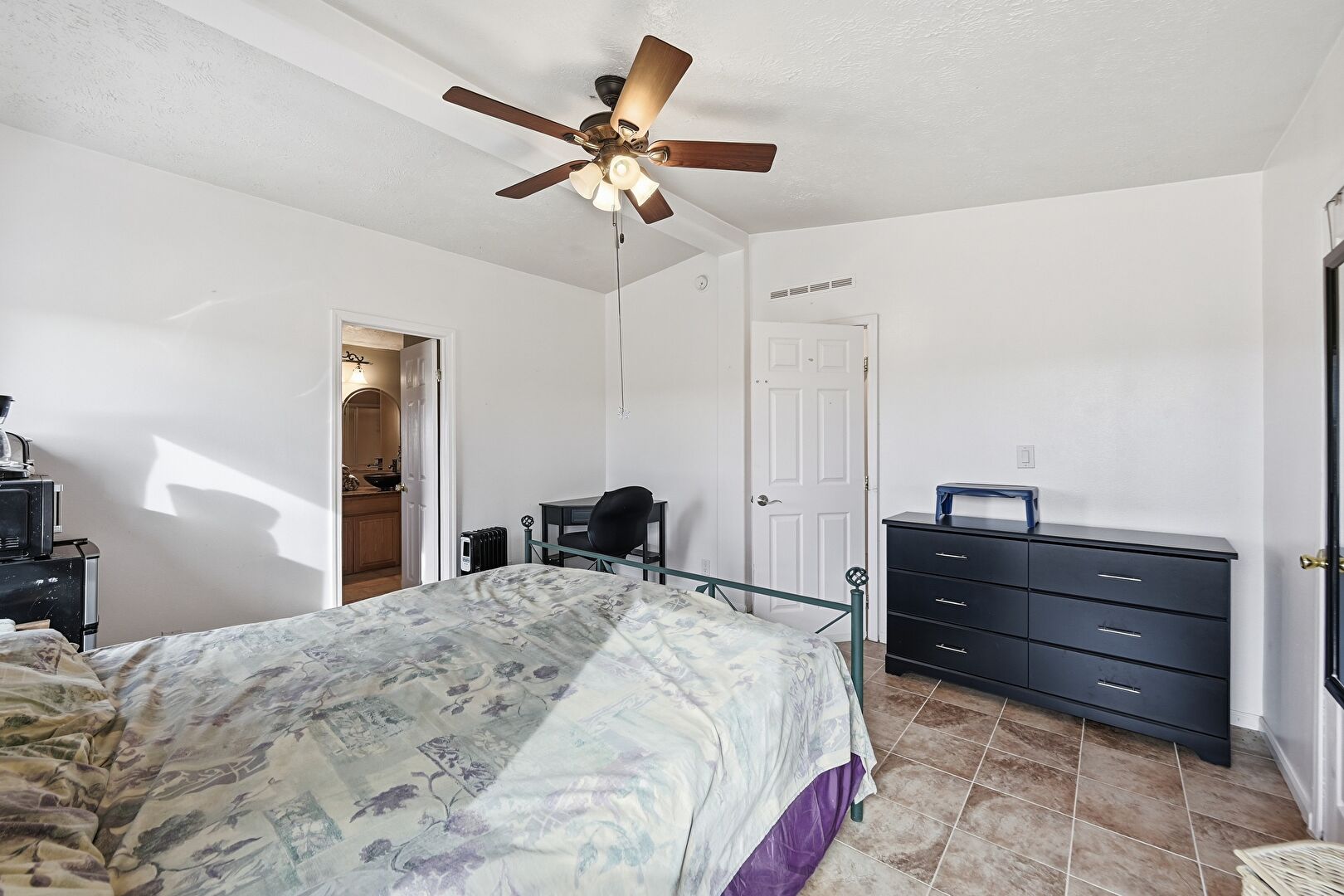 Baseboards Wall, Beamed Ceiling, Ceiling Fan, Drywall, Ensuite Bathroom, Natural Light, Textured Ceiling, Tile Floor, Vaulted Ceiling, Vent, Baseboards Wall, Tile Floor