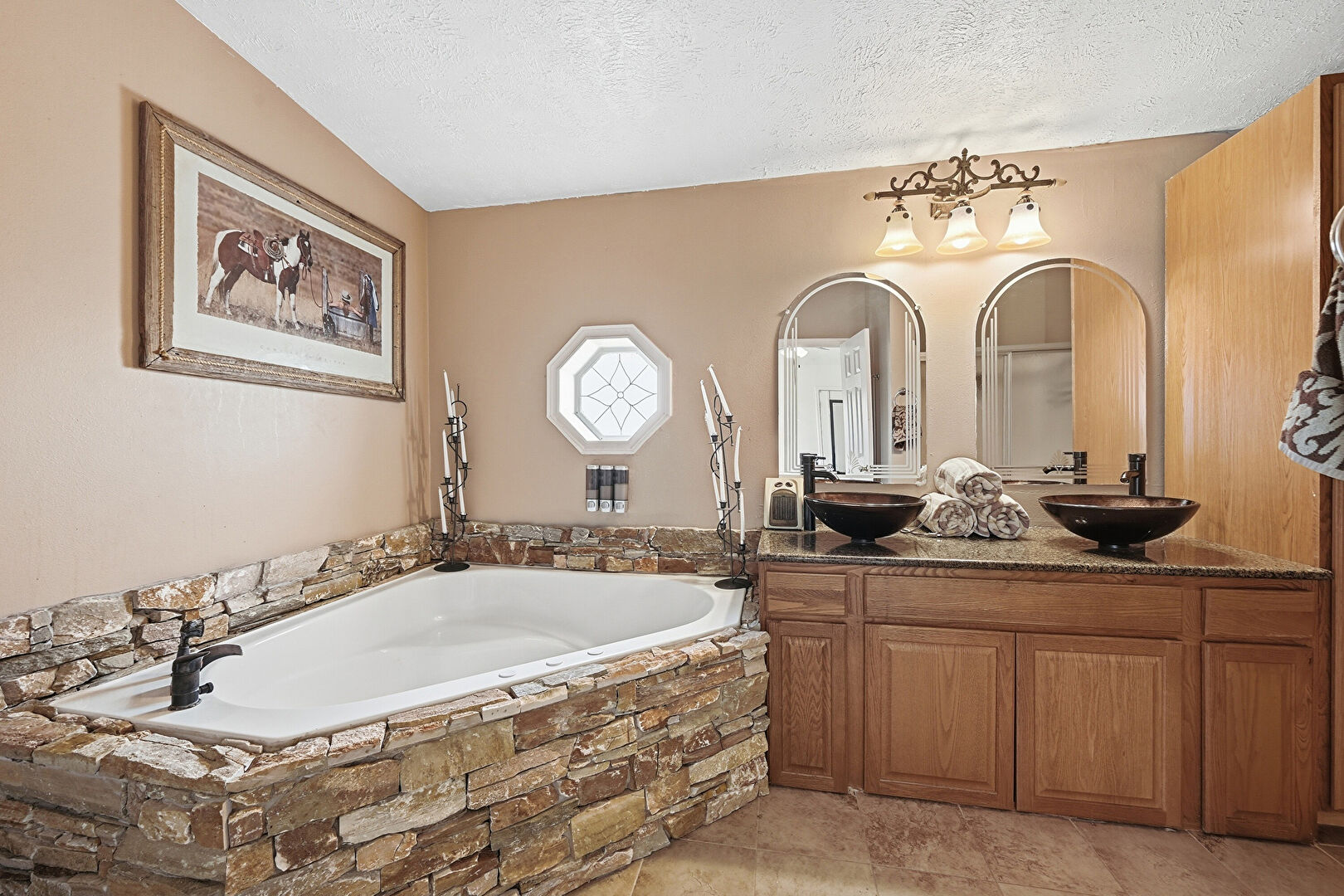 Baseboards Wall, Double Vanity, Drywall, Full Bathroom, Stone Finish Floor, Textured Ceiling, Vent, Double Vanity, Natural Light