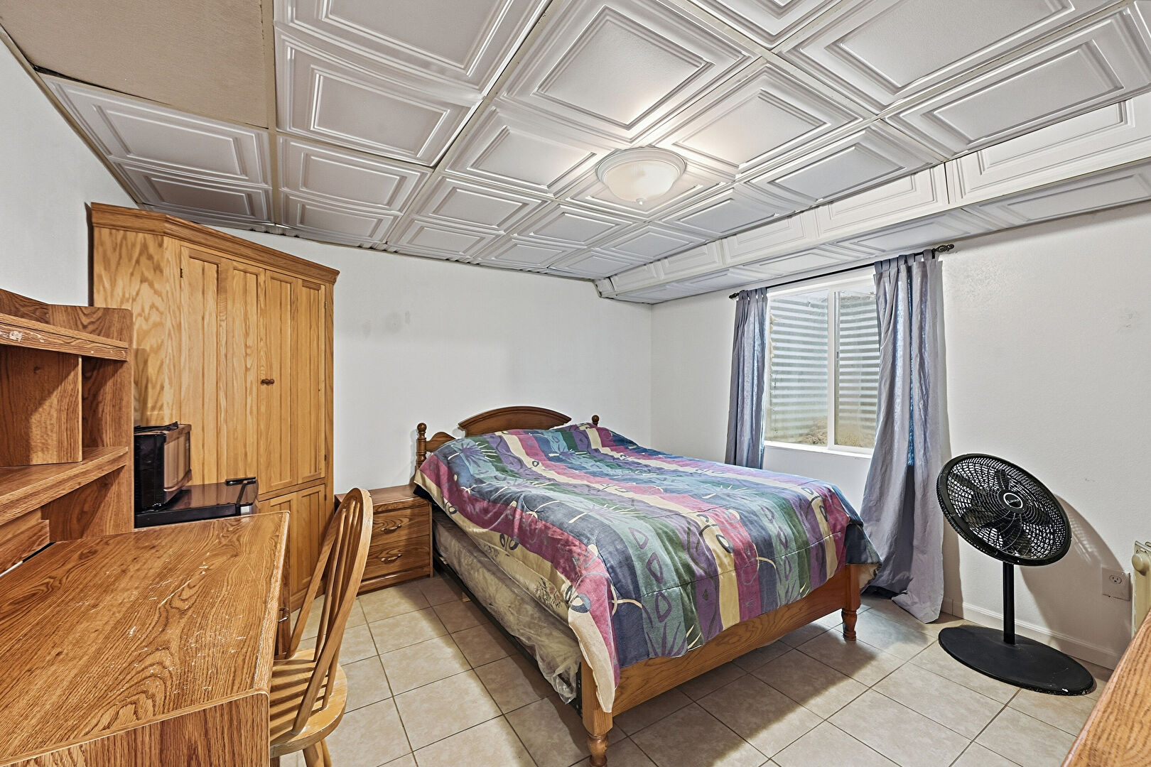 Baseboards Wall, Ceiling Fan, Closet, Drywall, Natural Light, Textured Ceiling, Tile Floor, Tin Ceiling, Vaulted Ceiling, Vent, Basement, Drywall, Textured Ceiling, Tile Floor
