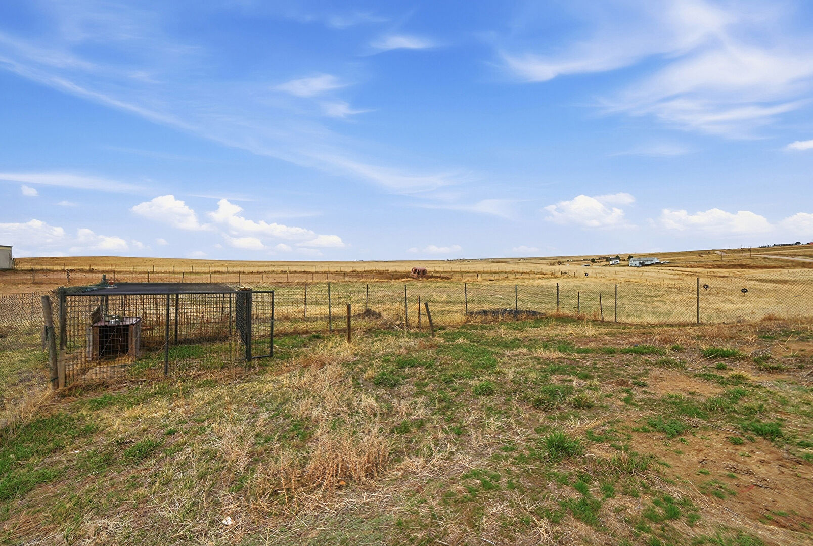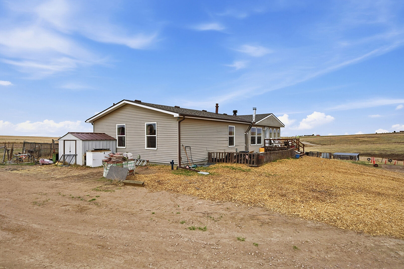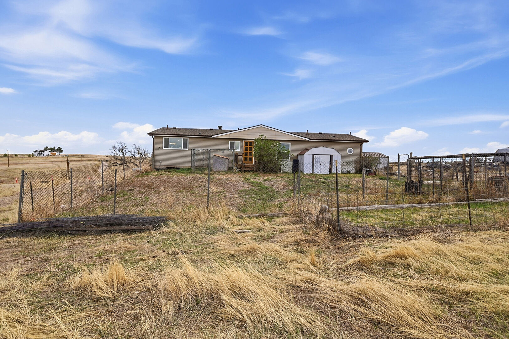 Downspout, Fence, Gutters, Horizontal Siding, Lawn, Outdoor Structure, Rural View, Shed