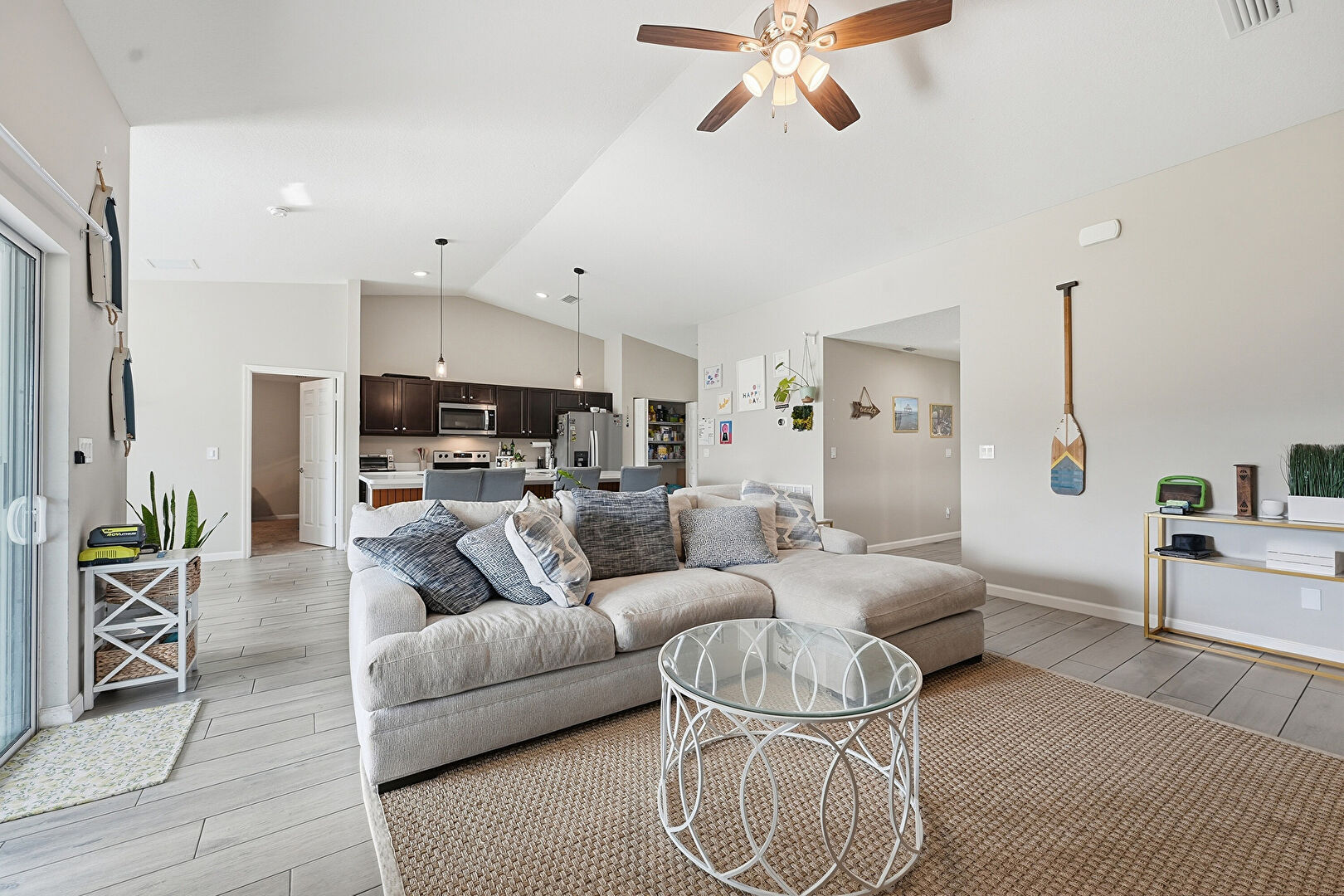 Baseboards Wall, Cathedral Ceiling, Ceiling Fan, Drywall, Fireplace, High Ceiling, L Shaped Kitchen, Natural Light, One Wall Kitchen, Toaster, Vaulted Ceiling, Vent, Wood Finish Floor, Ceiling Fan, High Ceiling, Vaulted Ceiling, Wood Finish Floor