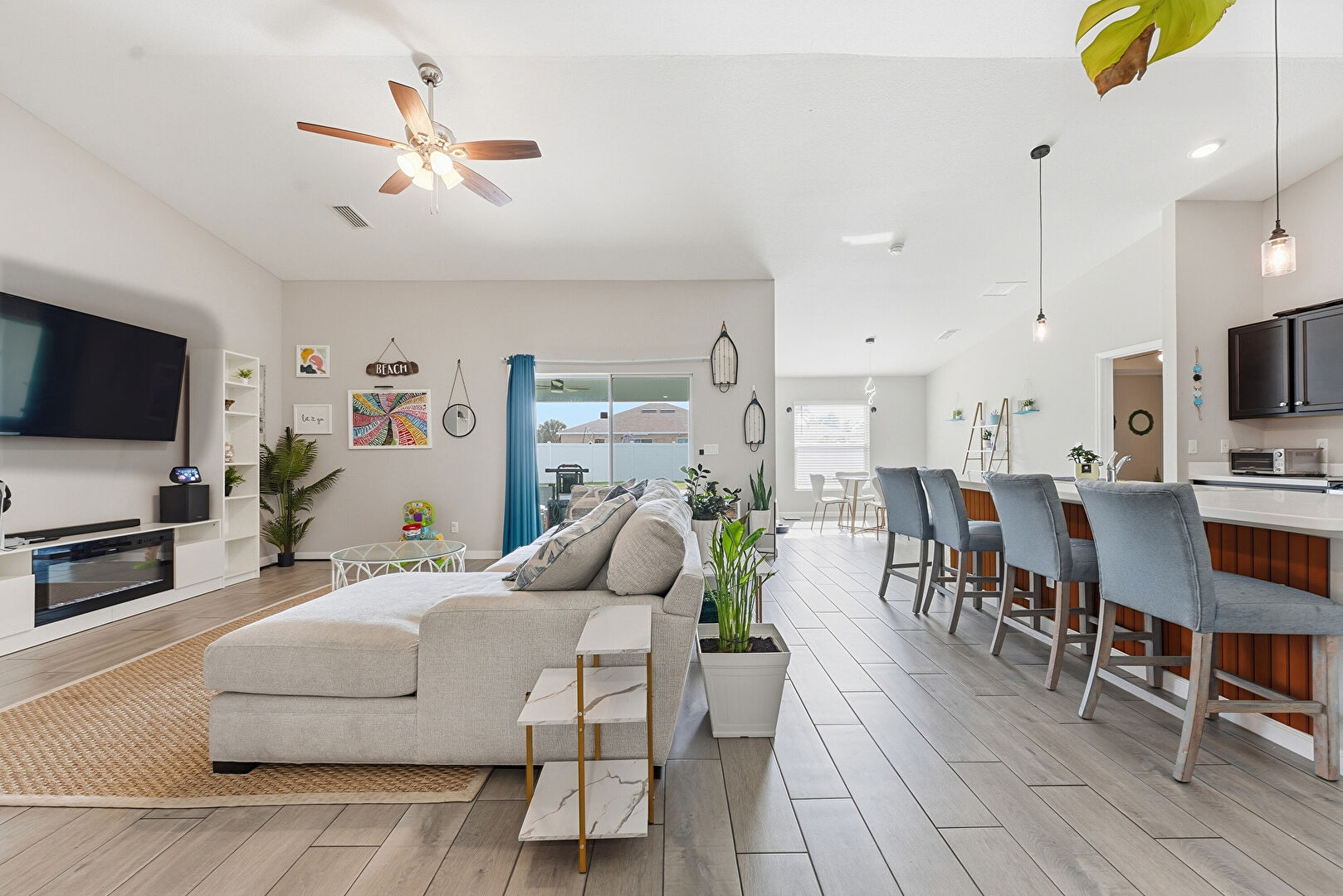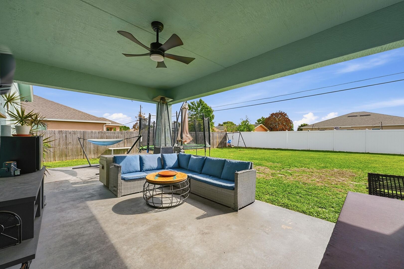 Ceiling Fan, Fence, Outdoor Dining Area, Outdoor Living Space, Patio, Trampoline, Lawn, Outdoor Living Space