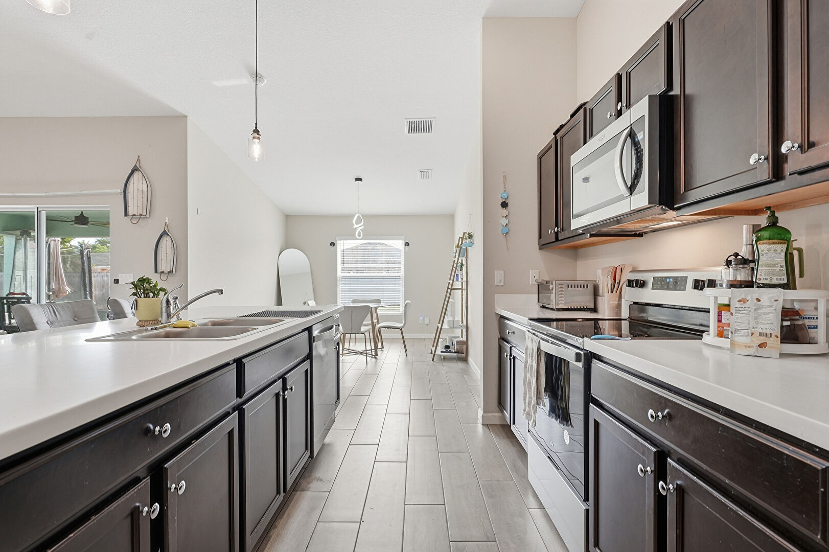 Baseboards Wall, Dark Brown Cabinets, Drywall, High Ceiling, Kitchen Bar, Kitchen Island, Natural Light, One Wall Kitchen, Pendant Lighting, Recessed Lighting, Shaker Cabinets, Stone Countertops, Toaster, Vaulted Ceiling, Vent, Wood Finish Floor, Dark Brown Cabinets, Vent, Wood Finish Floor