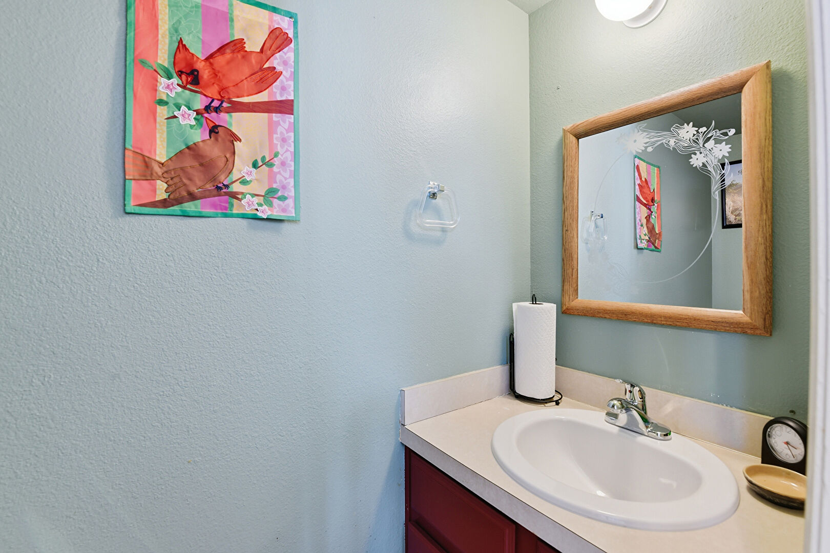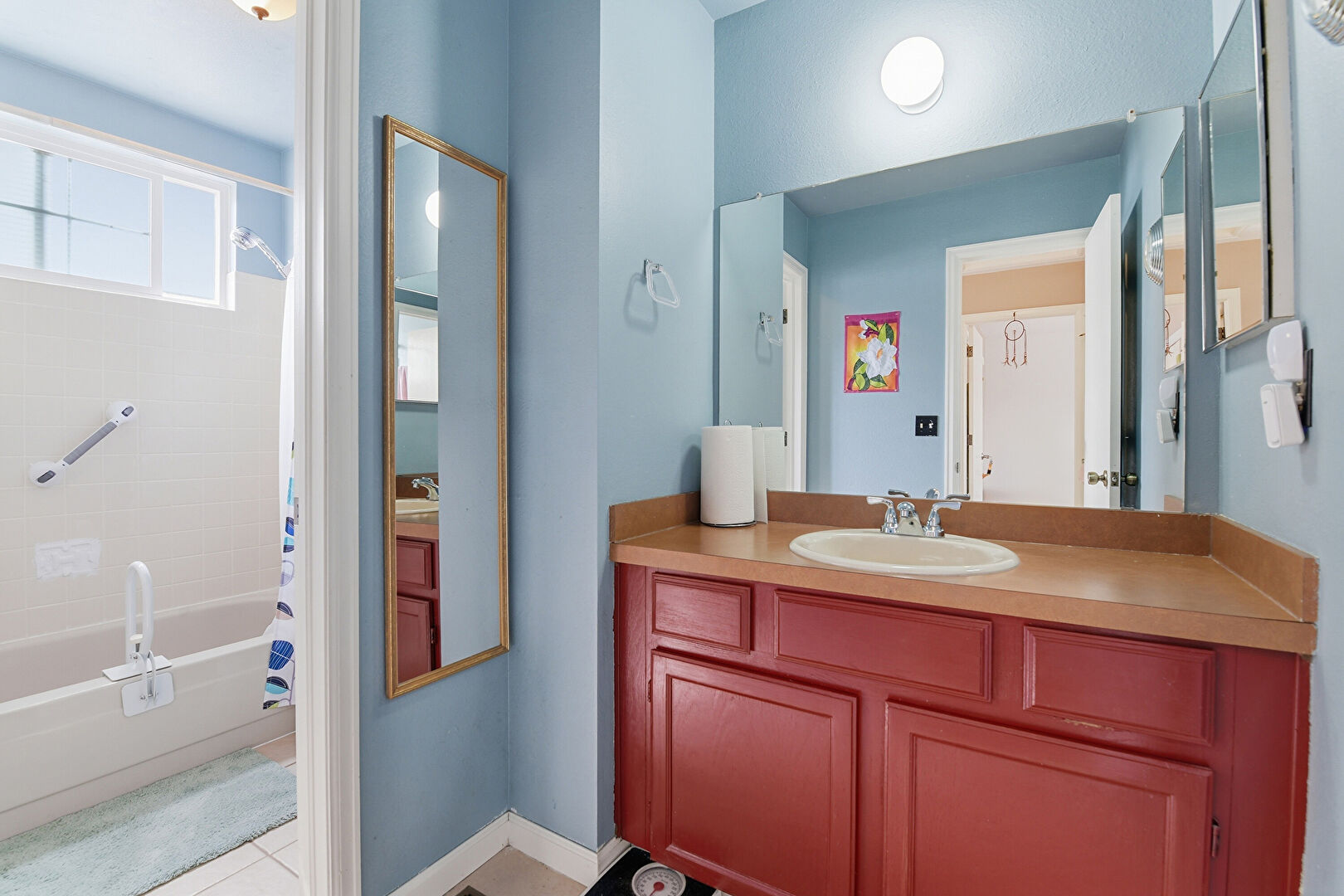 Baseboards Wall, Combined Bath Shower, Drywall, Full Bathroom, Tile Floor, Vanity, Natural Light, Textured Wall