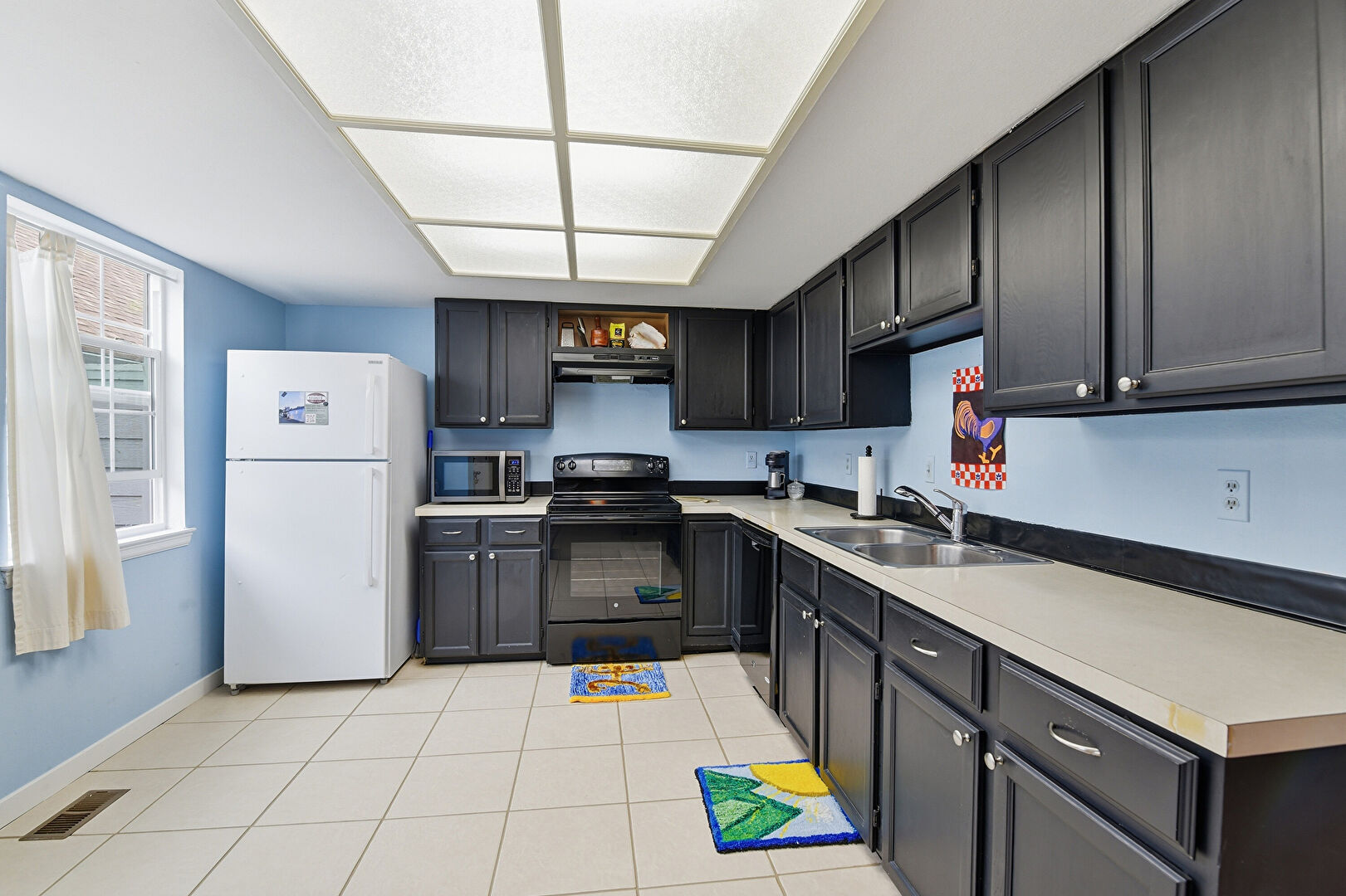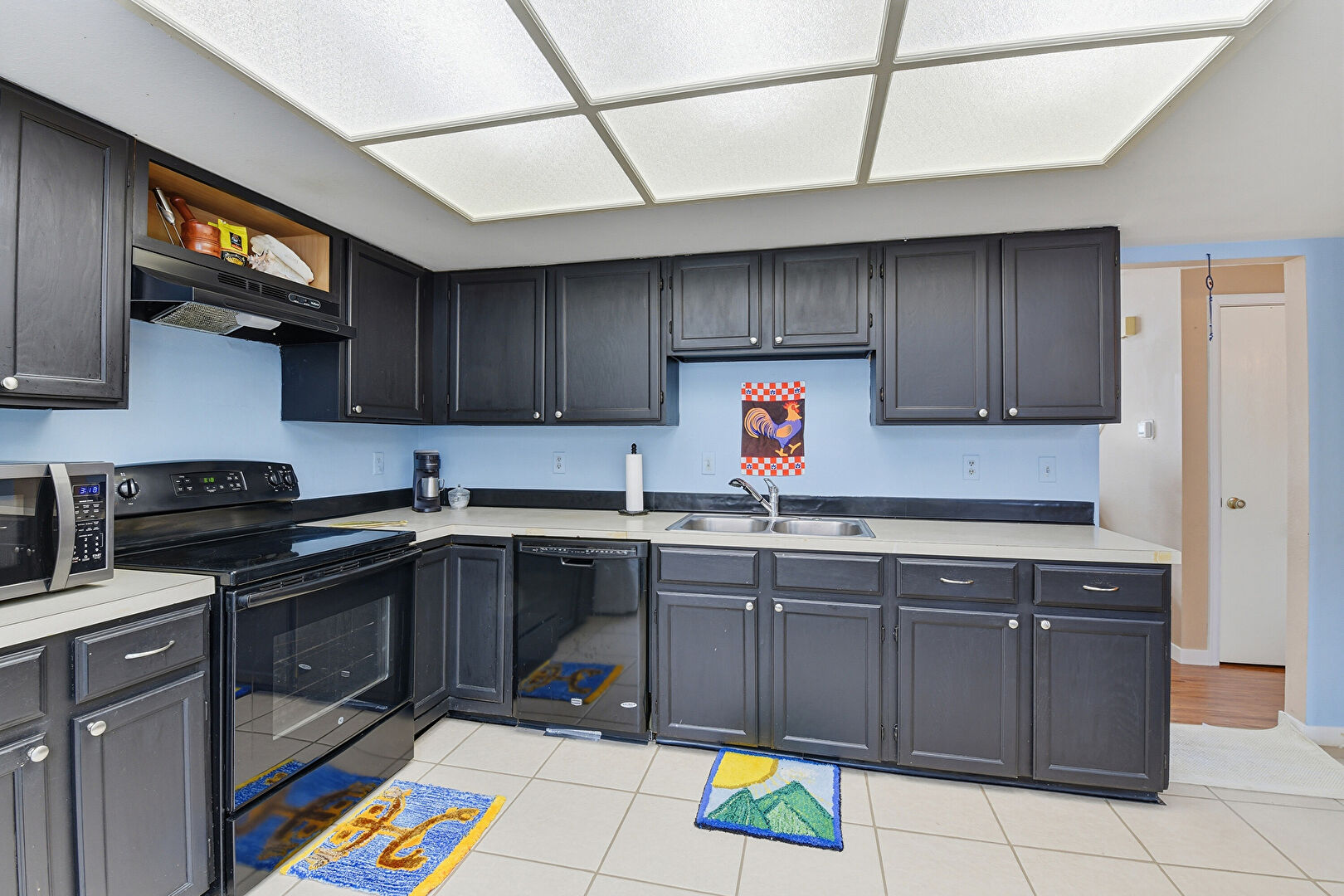 Baseboards Wall, Black Cabinets, Drywall, L Shaped Kitchen, Natural Light, Open Shelves, Shaker Cabinets, Tile Floor, Vent, Visible Hinge Cabinets, Natural Light, Tile Floor, Vent