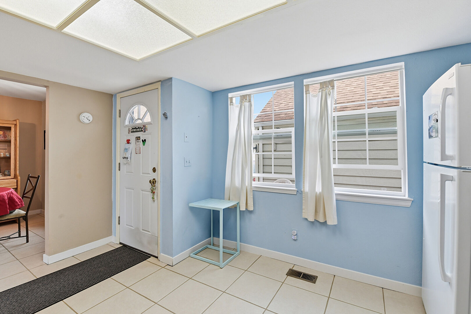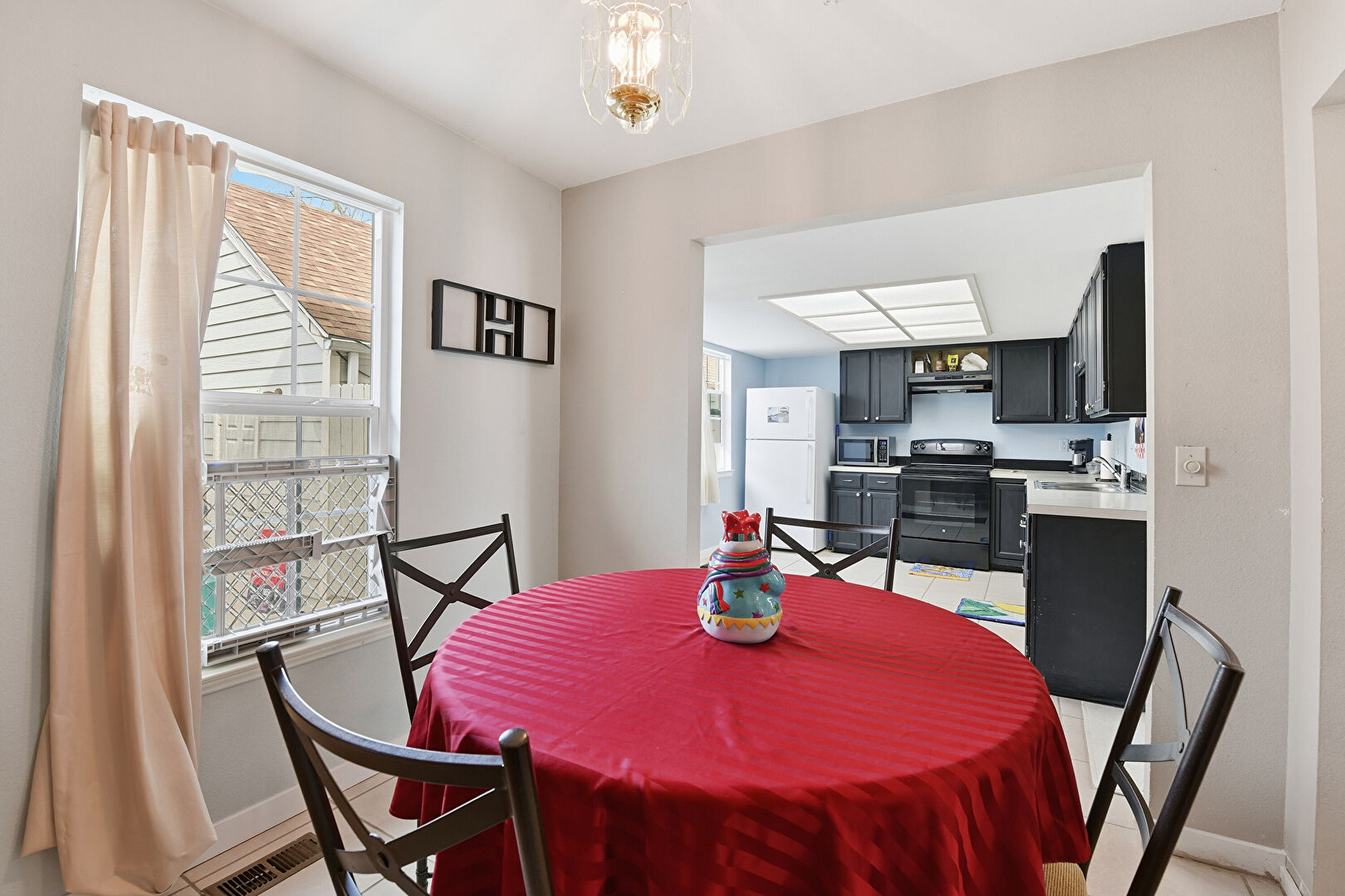 Baseboards Wall, Drywall, L Shaped Kitchen, Natural Light, Notable Chandelier, Tile Floor, Vent, Baseboards Wall, Tile Floor
