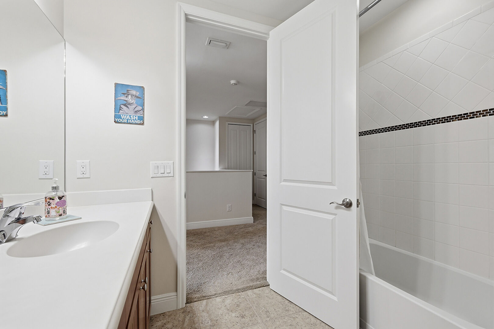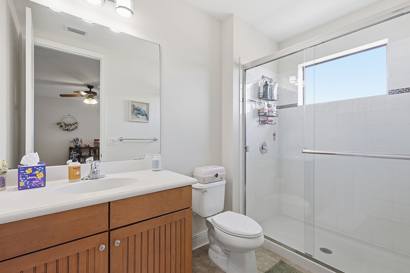 Carpet, Ceiling Fan, Combined Bath Shower, Drywall, Full Bathroom, Half Bathroom, Natural Light, Tile Floor, Vanity, Vent, Baseboards Wall, Drywall, Natural Light