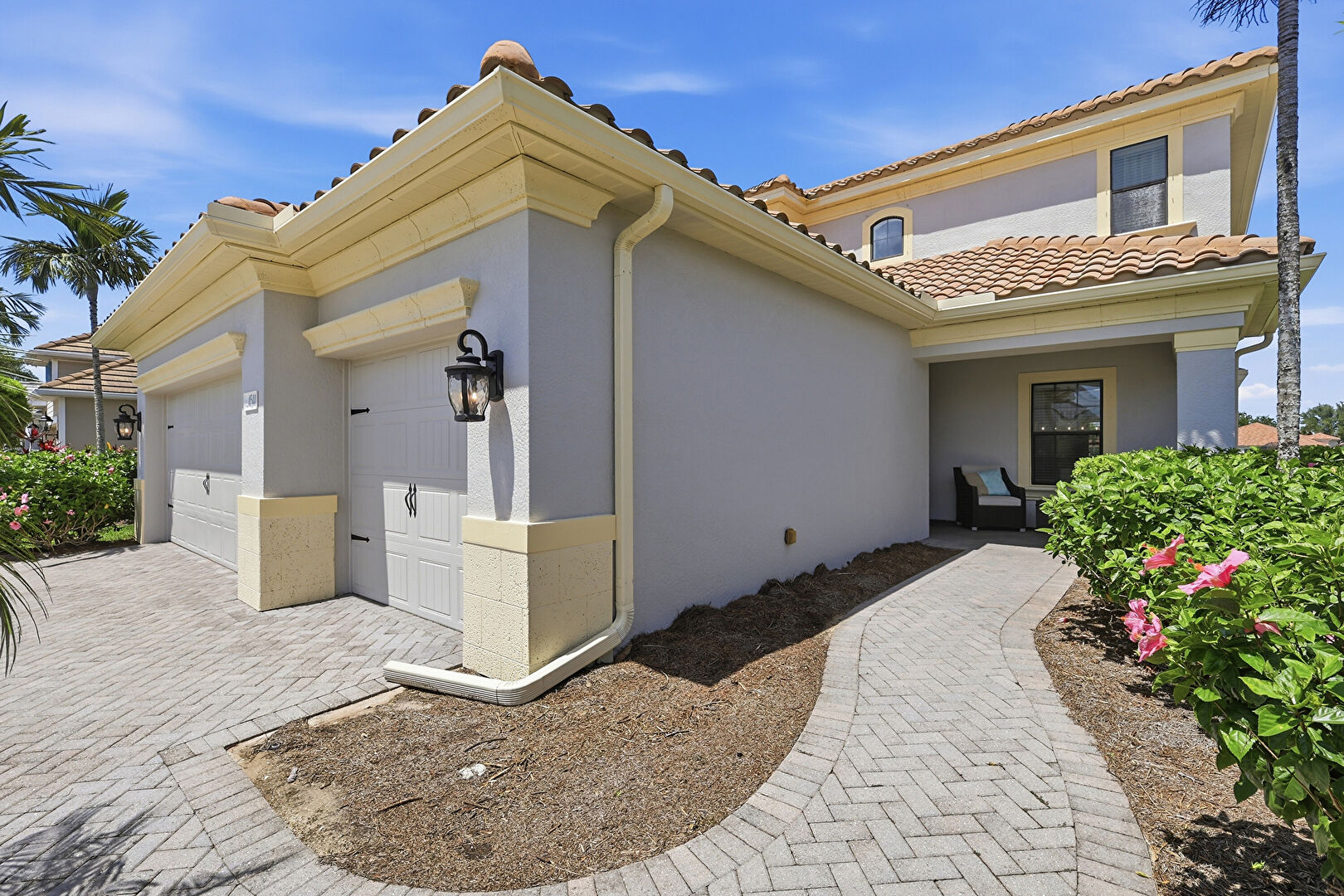 Downspout, Driveway, Gutters, Lawn, Pad Mount Transformer, Porch, Stucco Siding, Tile Roof, Gutters, Lawn, Tile Roof