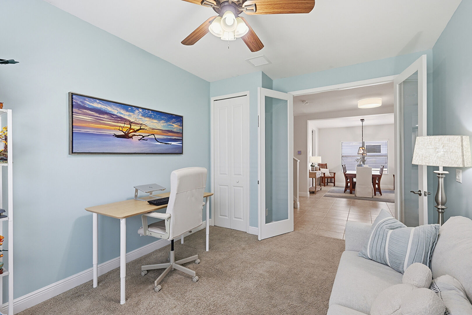 Baseboards Wall, Carpet, Ceiling Fan, Drywall, Natural Light, Office Area, Vent, Office Area, Tile Floor