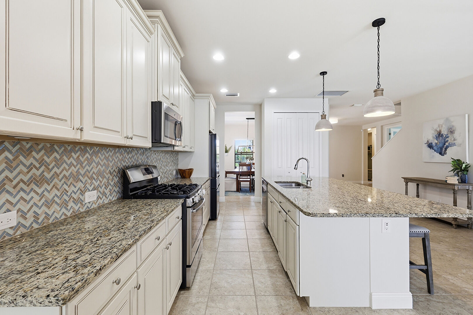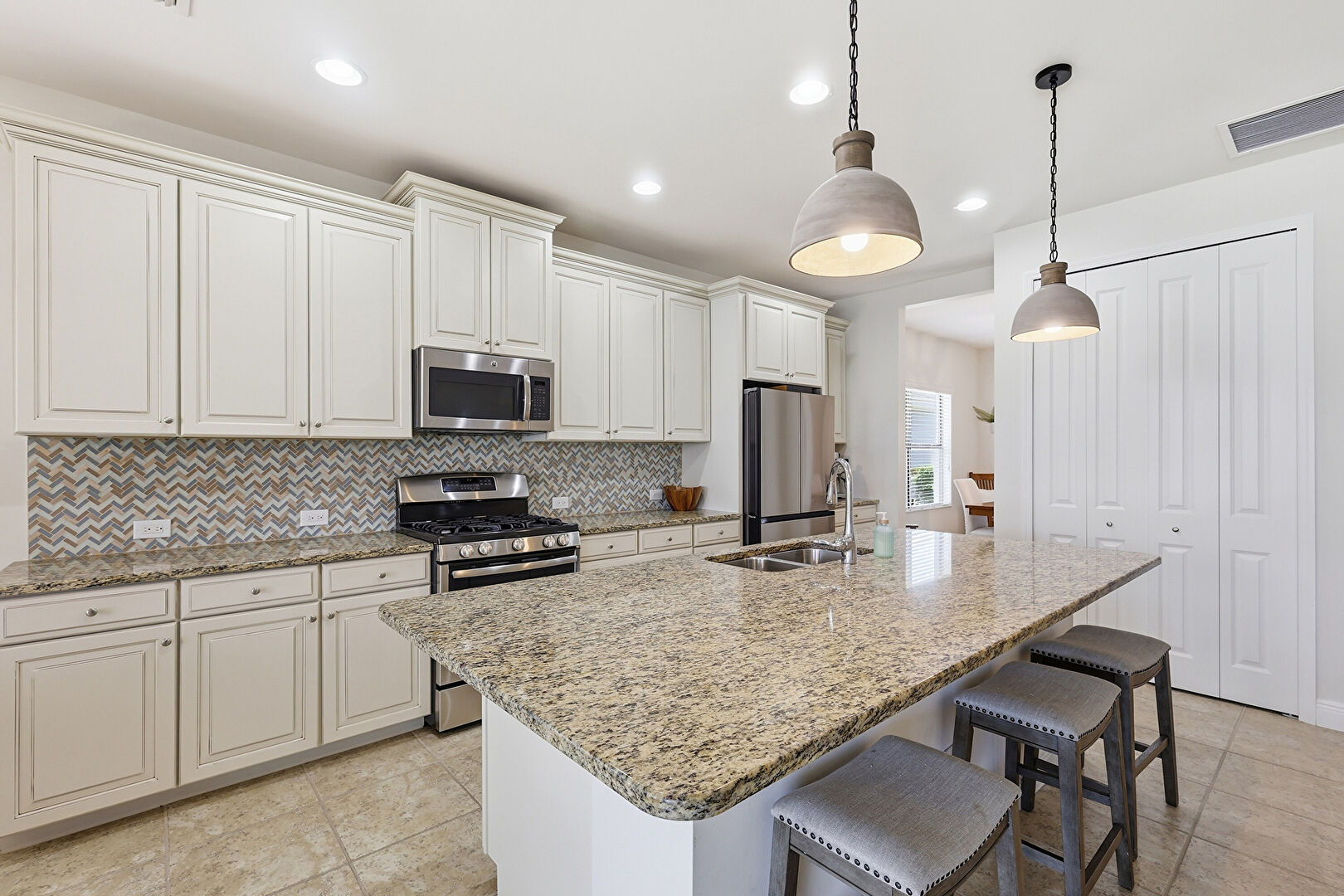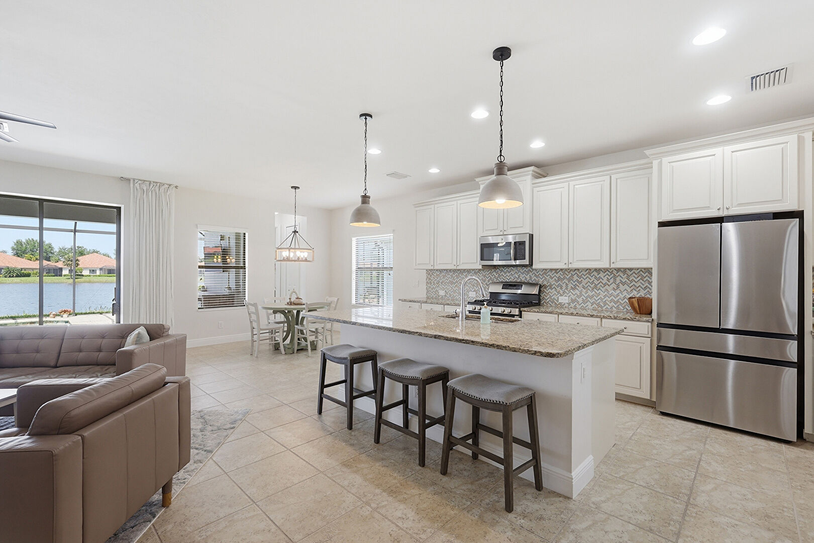 Baseboards Wall, Ceiling Fan, Crown Molding Cabinets, Drywall, Kitchen Bar, Kitchen Island, Natural Light, Notable Chandelier, One Wall Kitchen, Opens To Living Area, Pendant Lighting, Raised Cabinets, Recessed Lighting, Stone Countertops, Tile Floor, Vent, Water View, Baseboards Wall, Drywall, Kitchen Island, Opens To Living Area, Vent