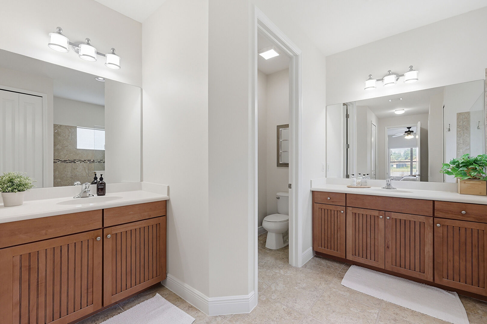 Baseboards Wall, Ceiling Fan, Closet, Drywall, Full Bathroom, Natural Light, Tile Floor, Two Single Vanities, Vanity, Water Closet, Baseboards Wall, Natural Light
